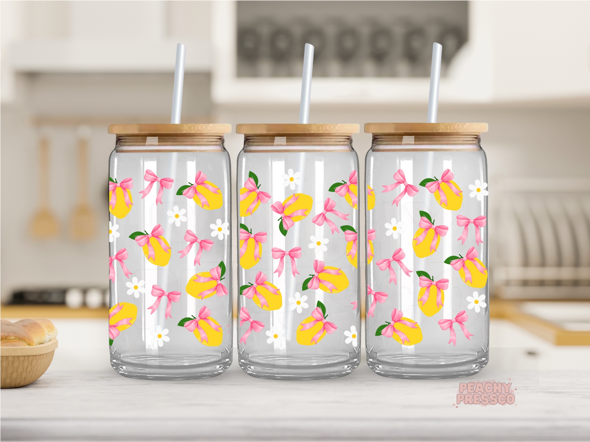 16oz Aesthetic Glass Cup – Lemon, Daisy & Coquette Bow Design with Bamboo Lid & Straw