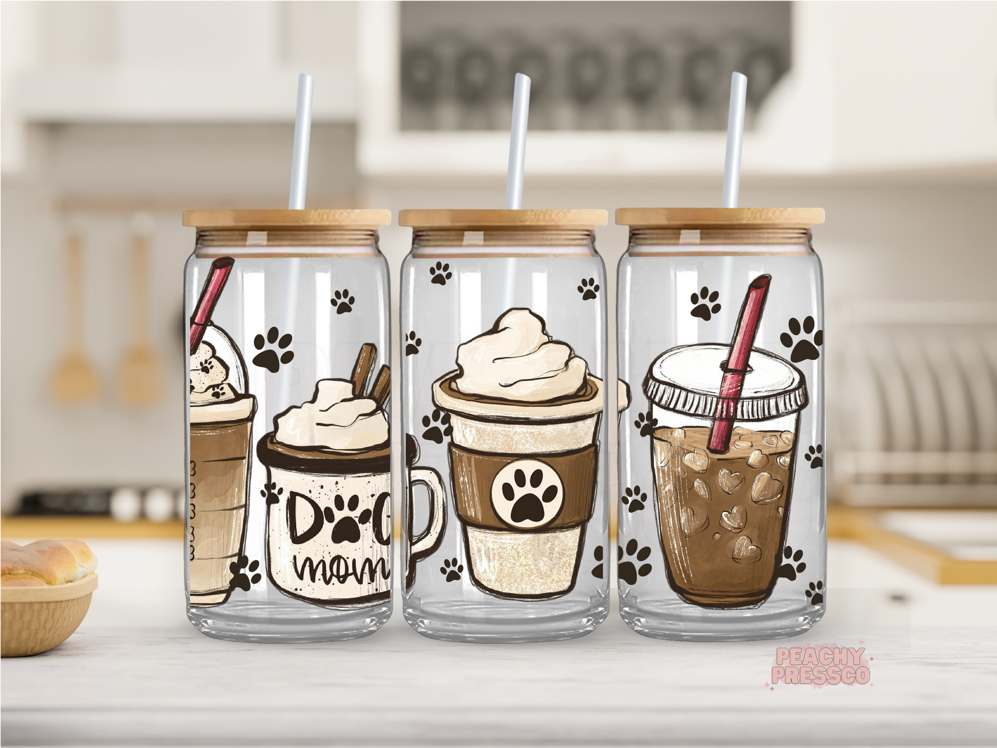 16oz Dog Mom, Paw Print Coffee Glass Cup with Lid & Straw