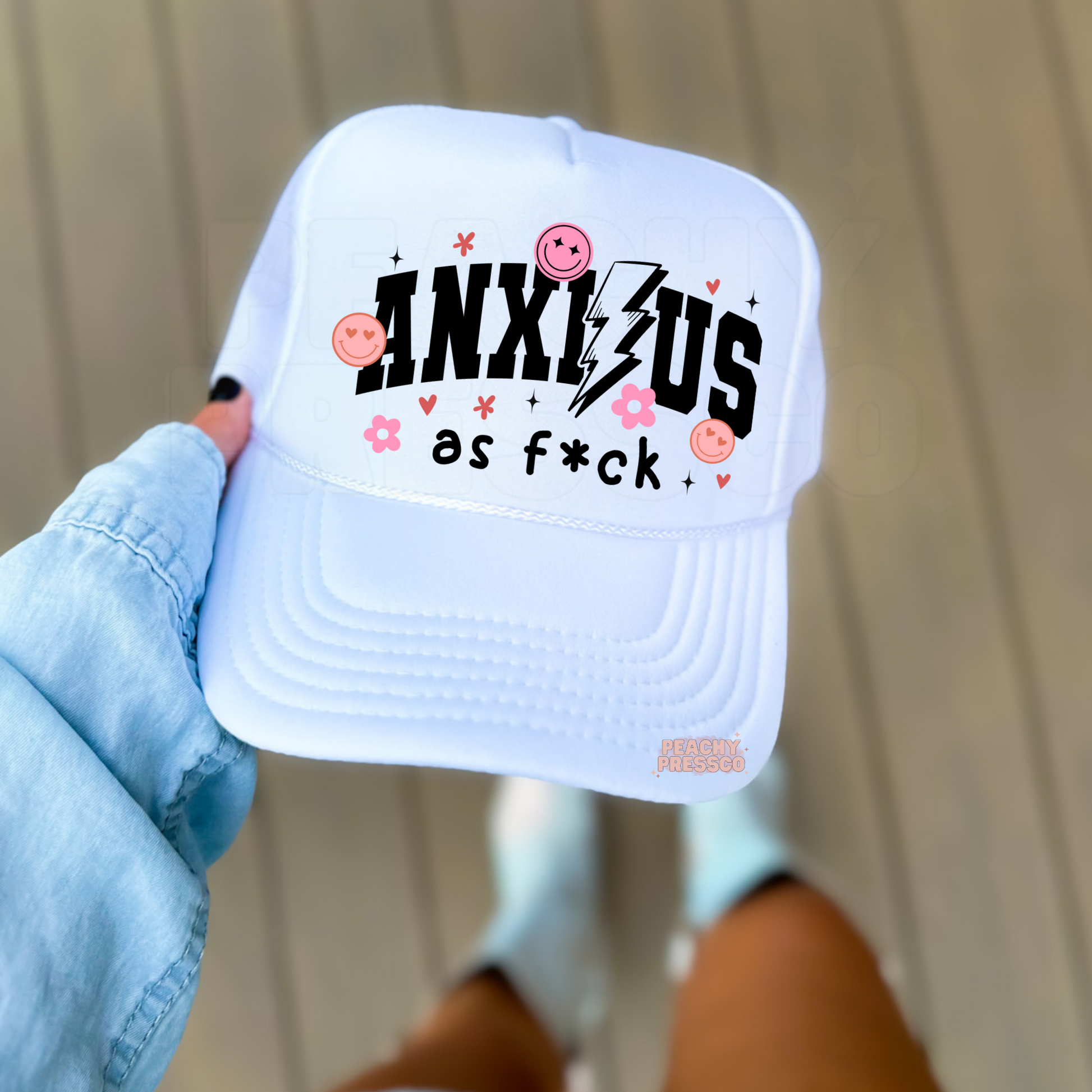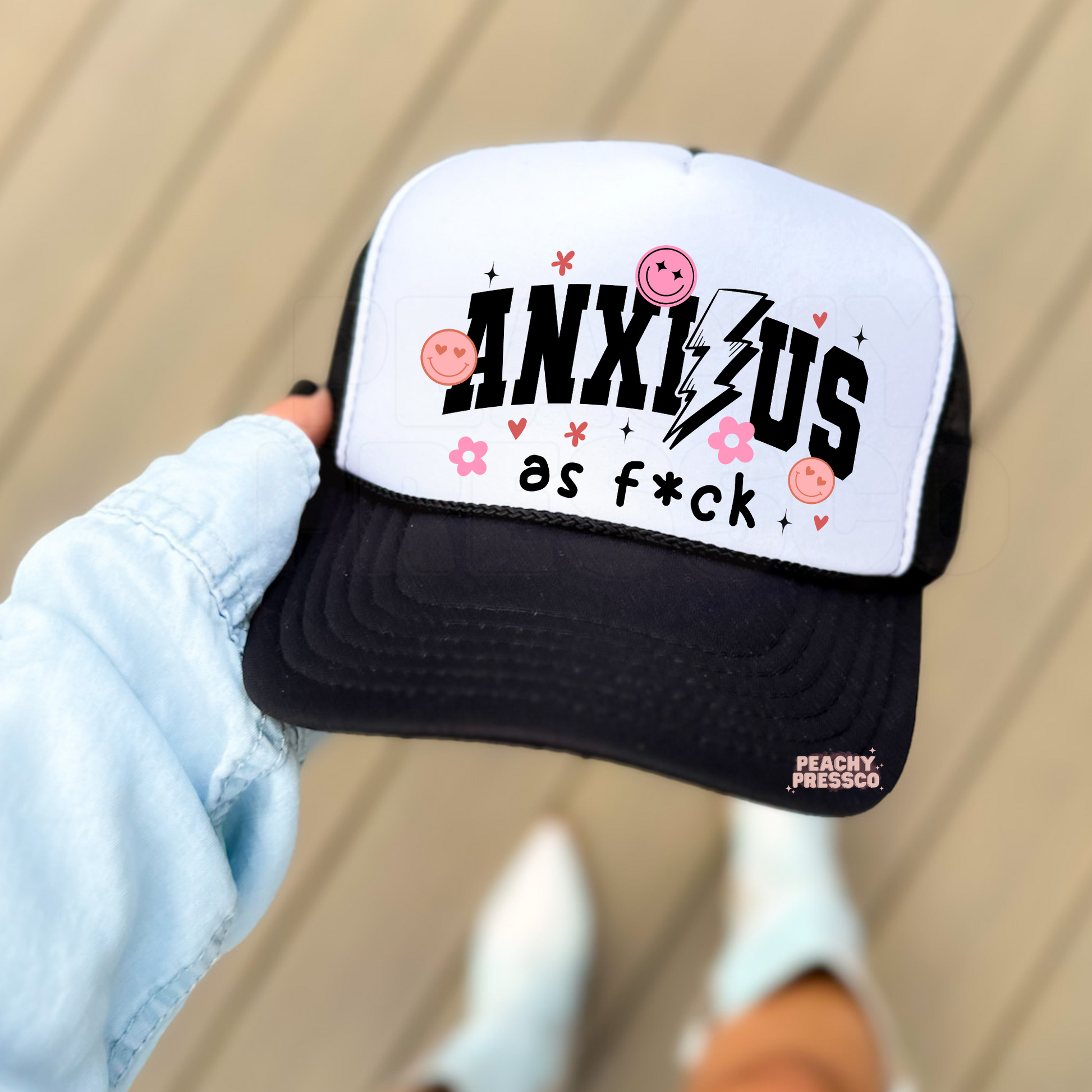 Anxious As F*ck Trucker Hat – Cute Smiley Face Cap with Lightning Bolt & Flowers