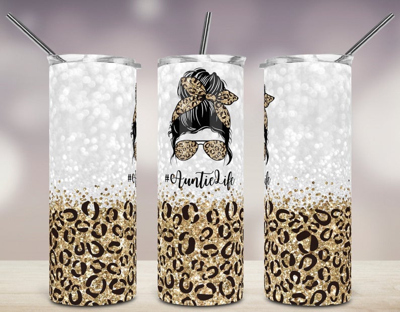 Auntie Life Leopard Tumbler – 20oz Glitter Leopard Print Cup with Straw