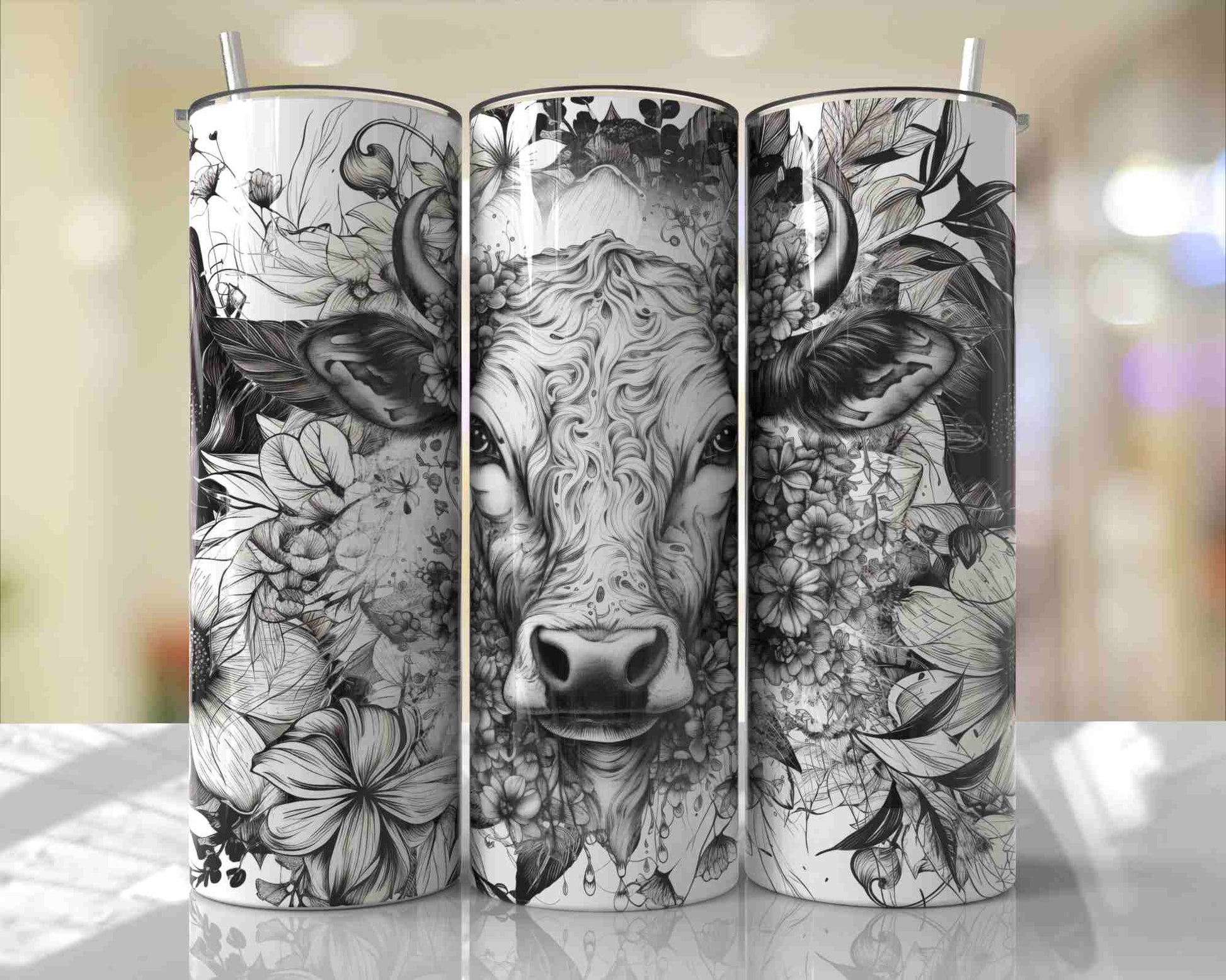 Black & White Floral Highland Cow Tumbler – 20oz Cow Art Drinkware