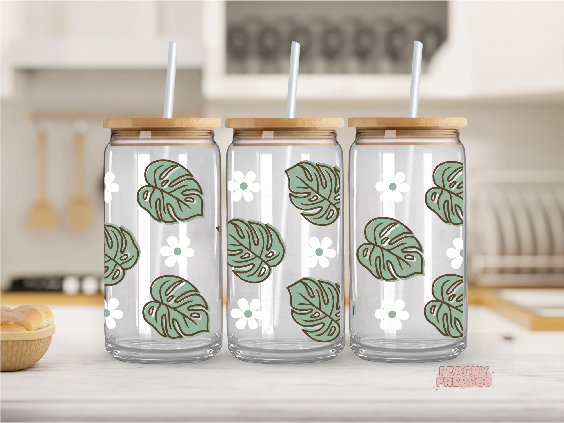 Boho Floral Aesthetic Monstera Leaf Glass Cup with Bamboo Lid
