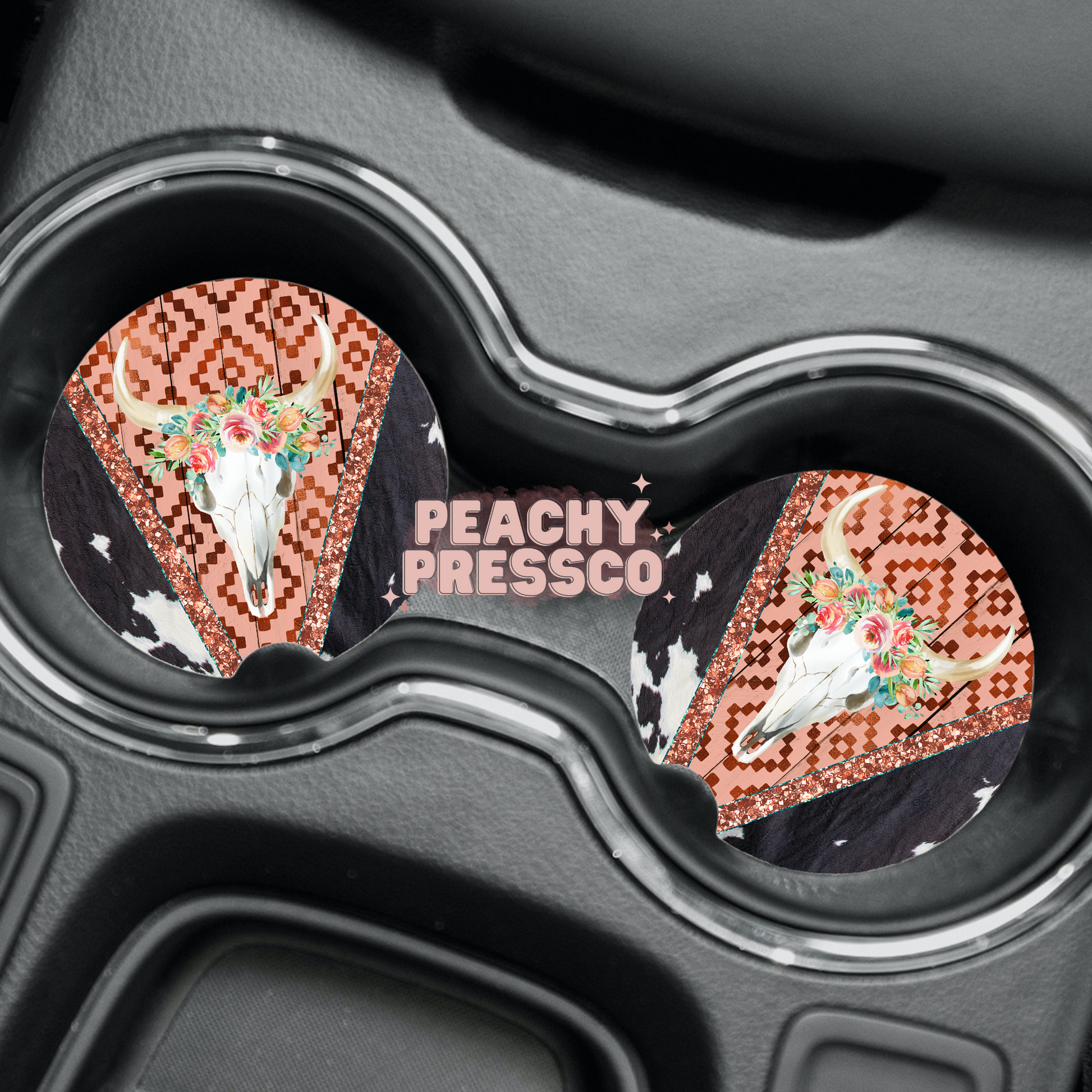 Boho Western Cow Skull Car Coaster – Floral Aztec Cow Print