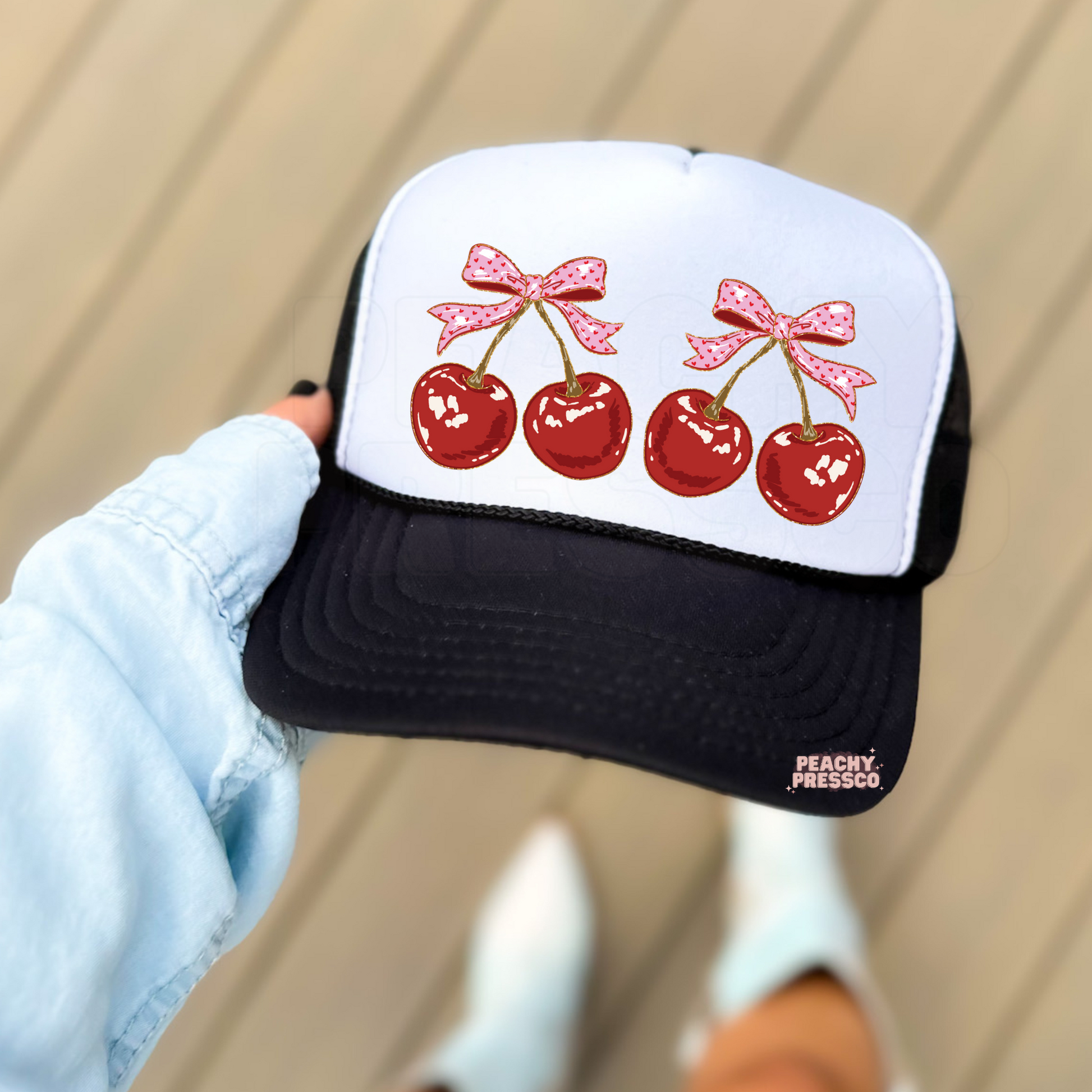 Cherry Bow Trucker Hat – Cute Coquette Aesthetic Red Cherries & Pink Bows Mesh Cap