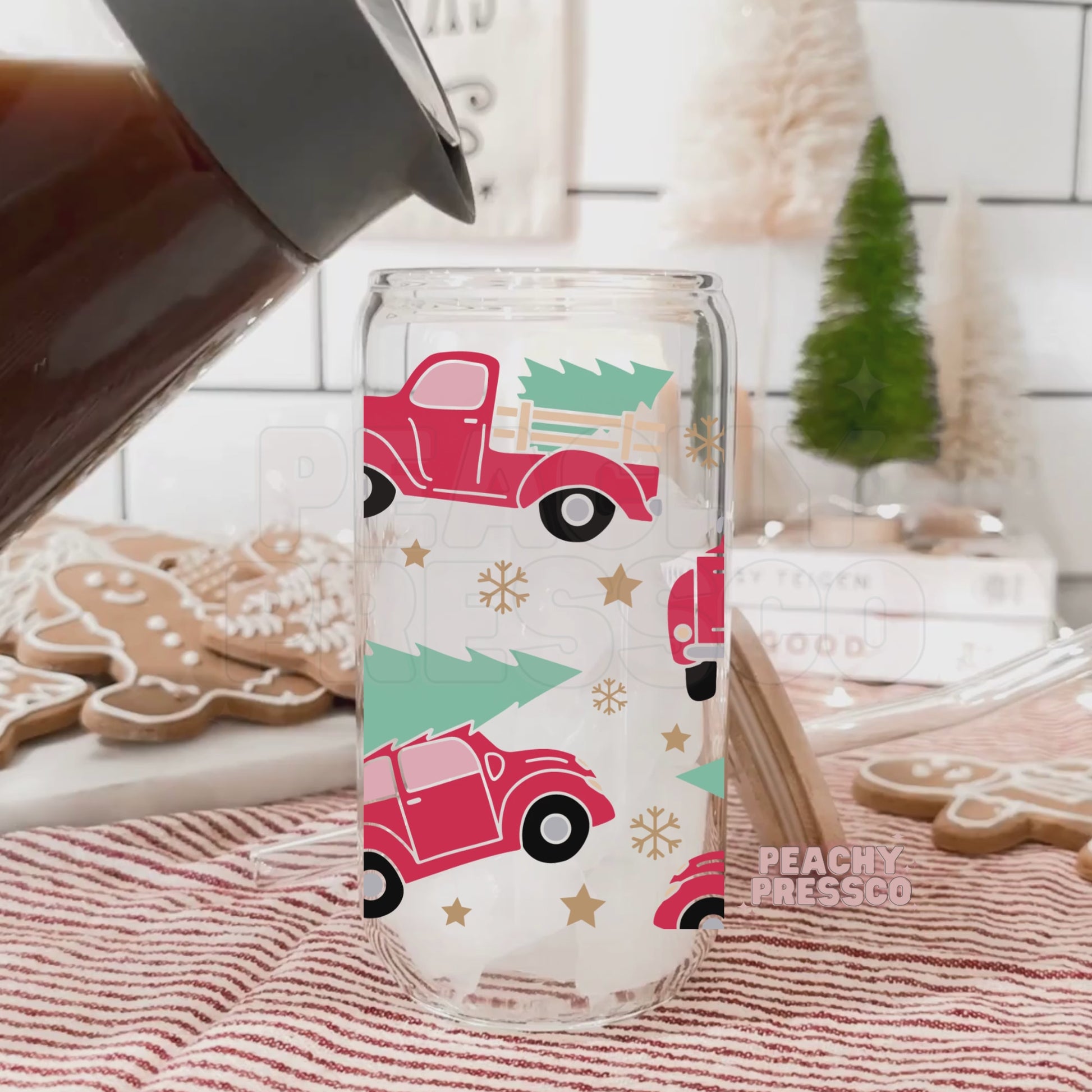 Christmas Truck Glass Cup – 16oz Holiday Tumbler with Vintage Red Truck & Tree Design