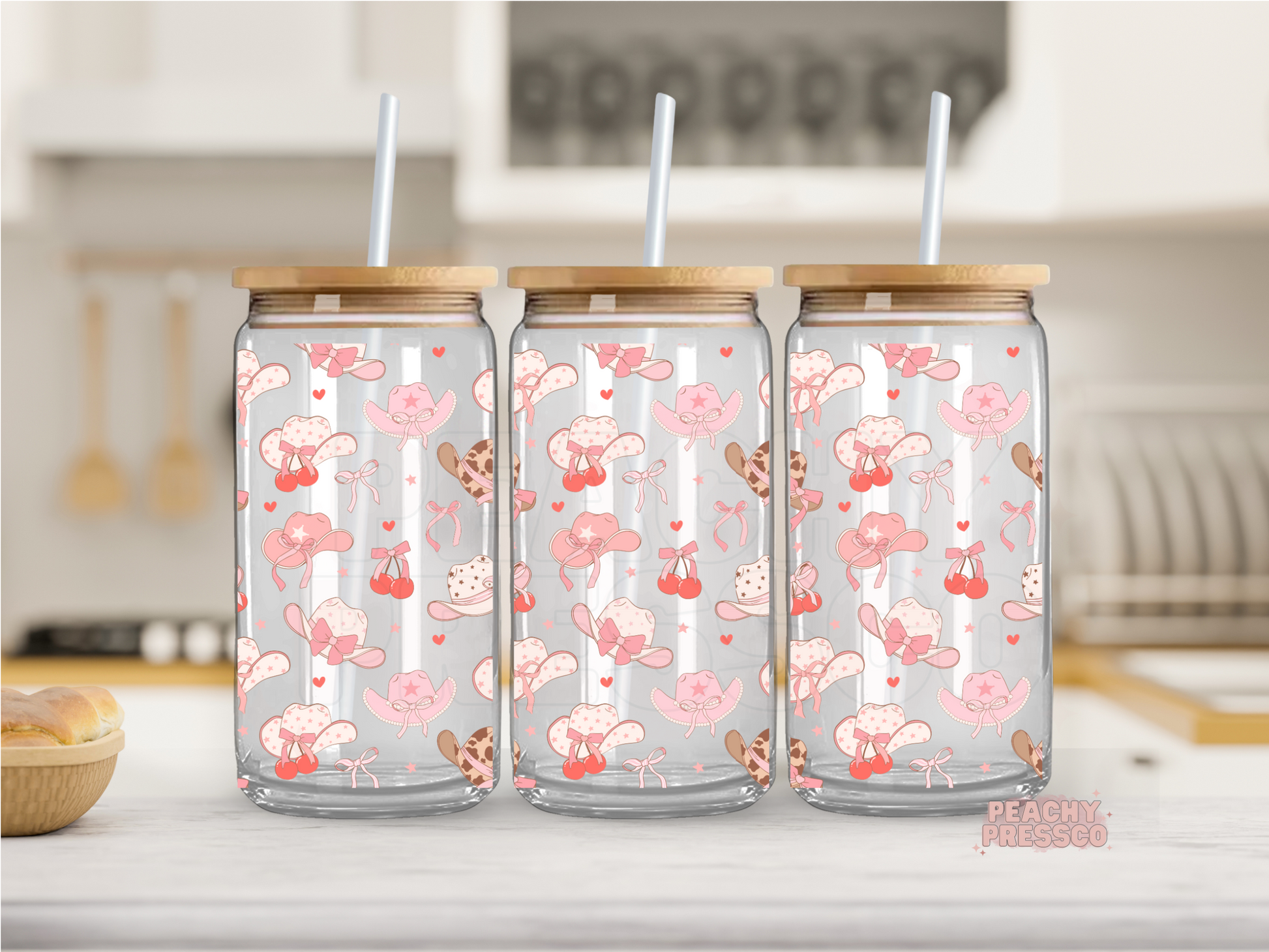 Cow Girl Hat Glass Cup – 16oz Iced Coffee Cup with Straw & Bamboo Lid