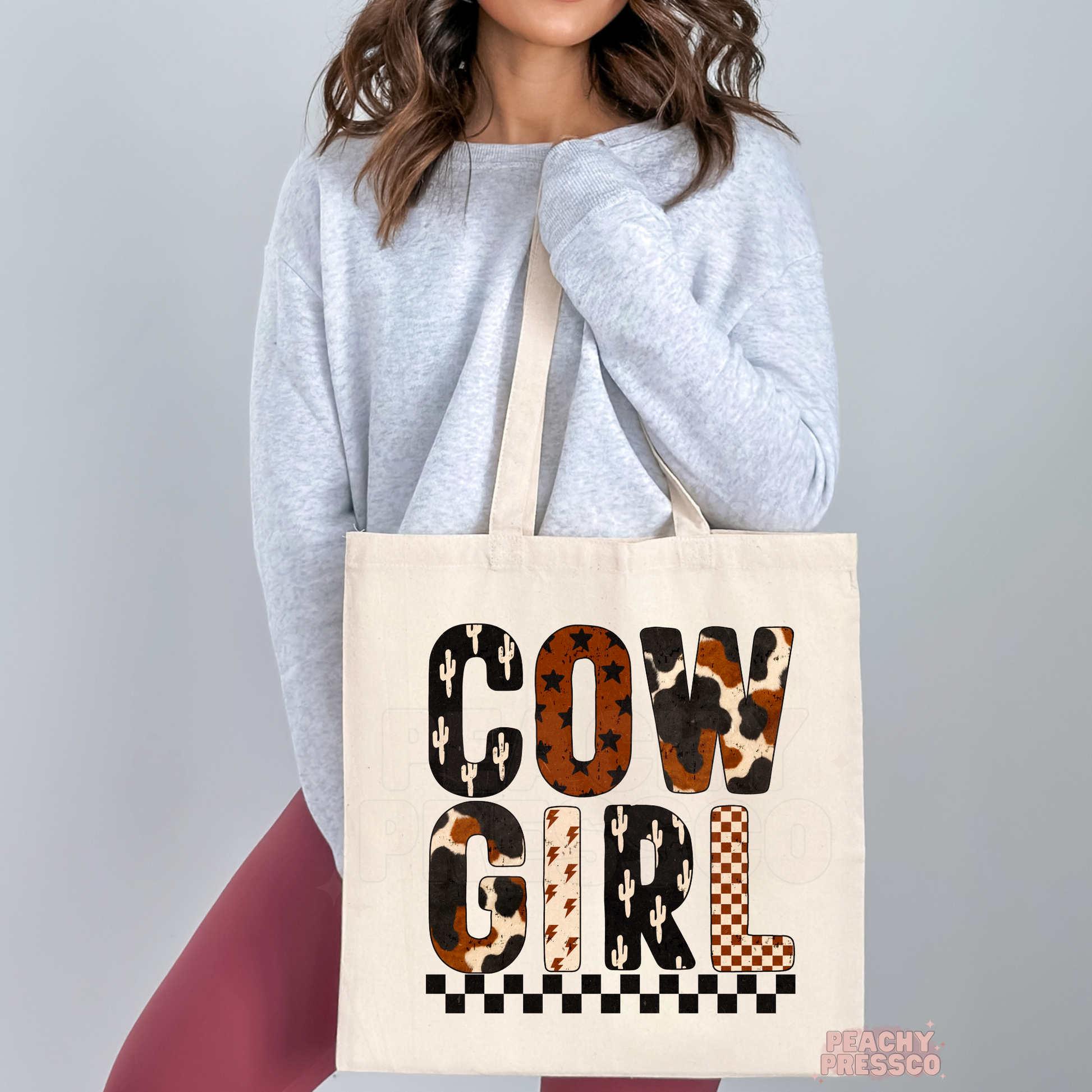 Cow Girl Western Tote Bag – Retro Cactus & Cow Print Canvas Bag