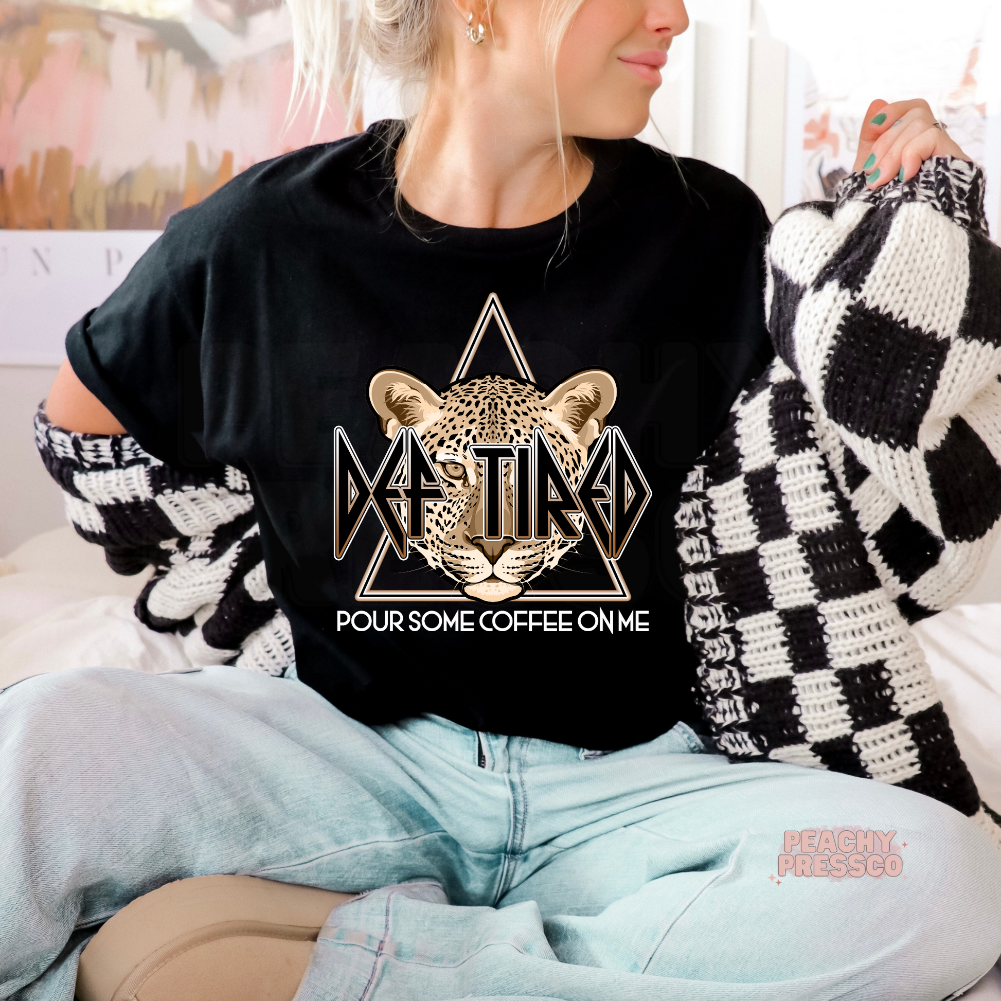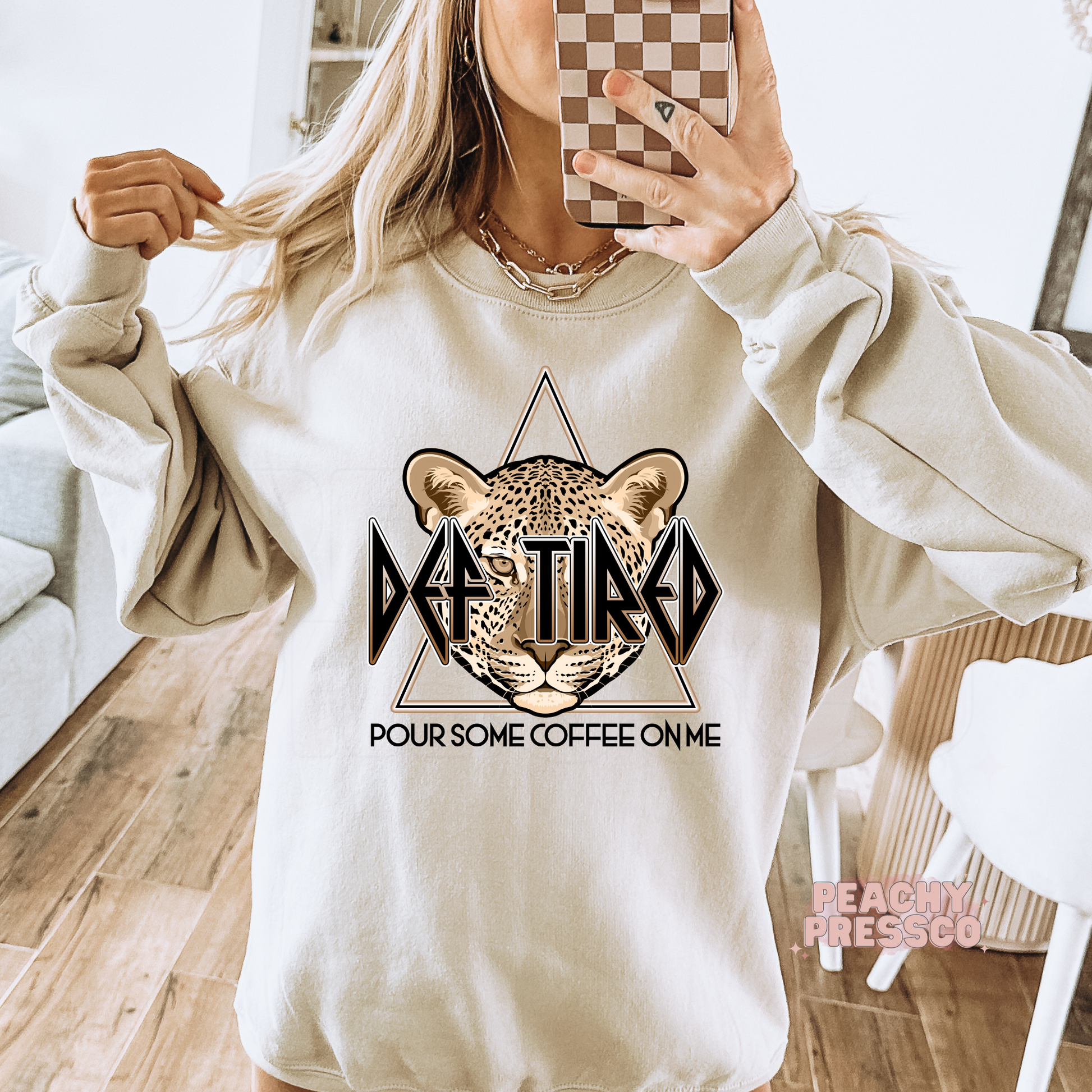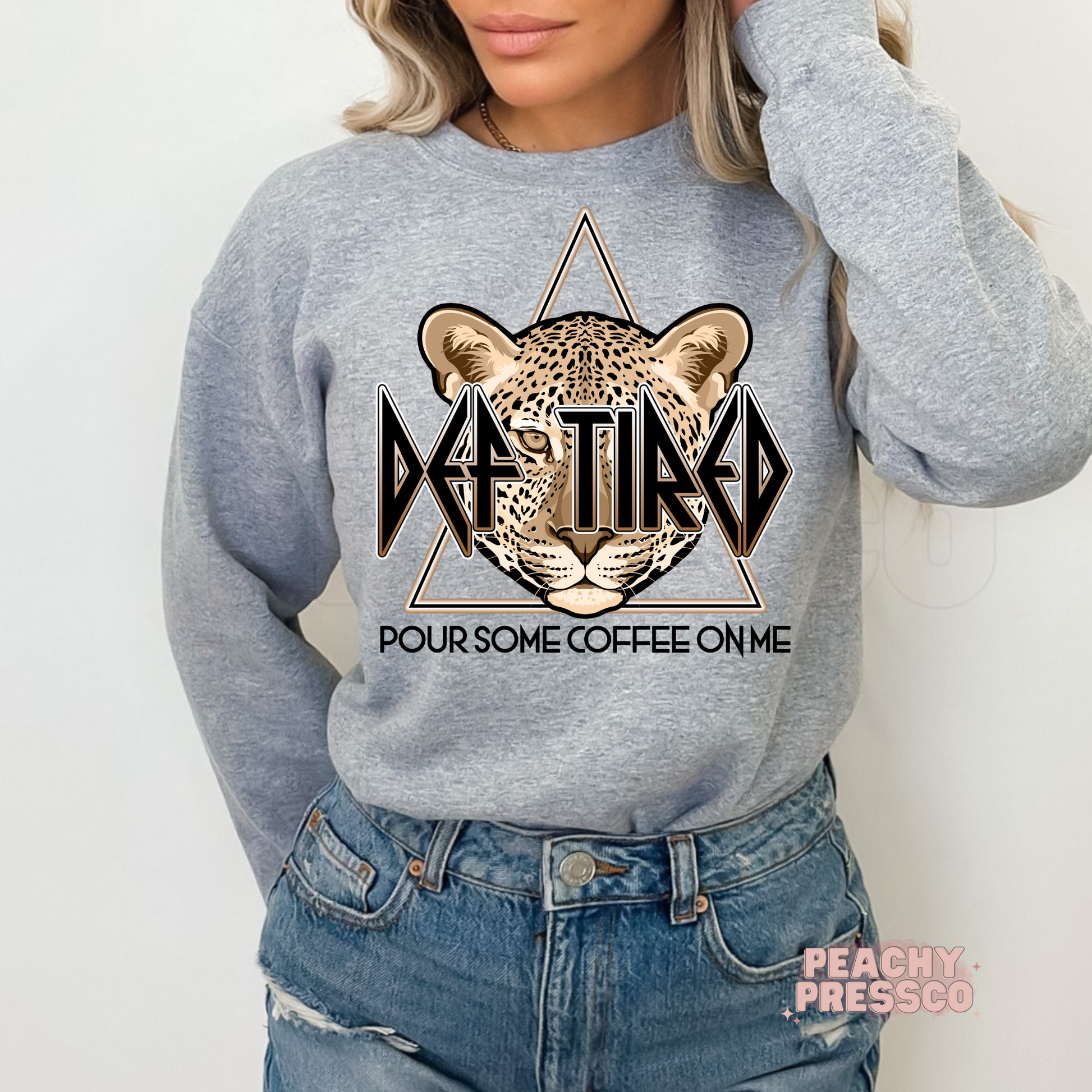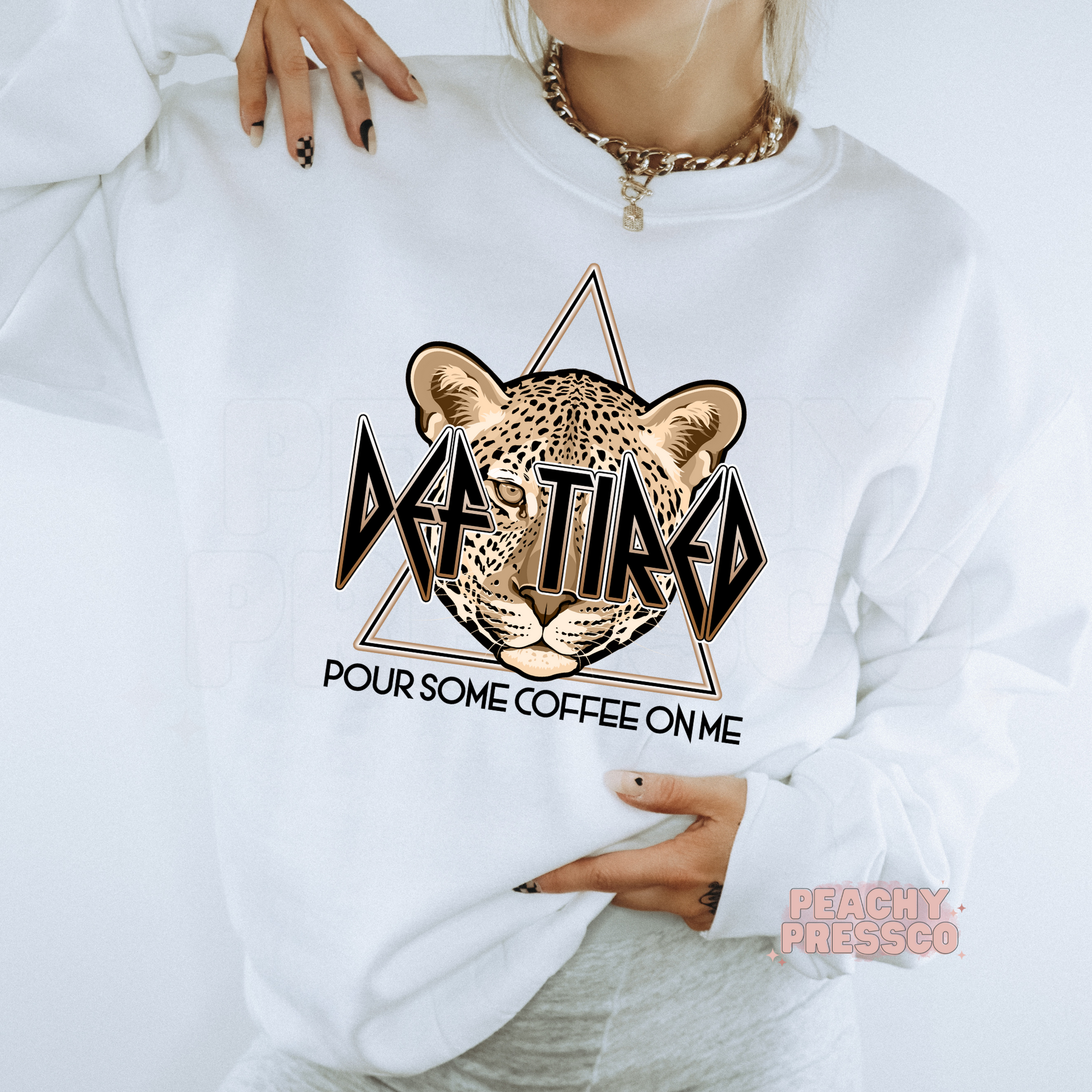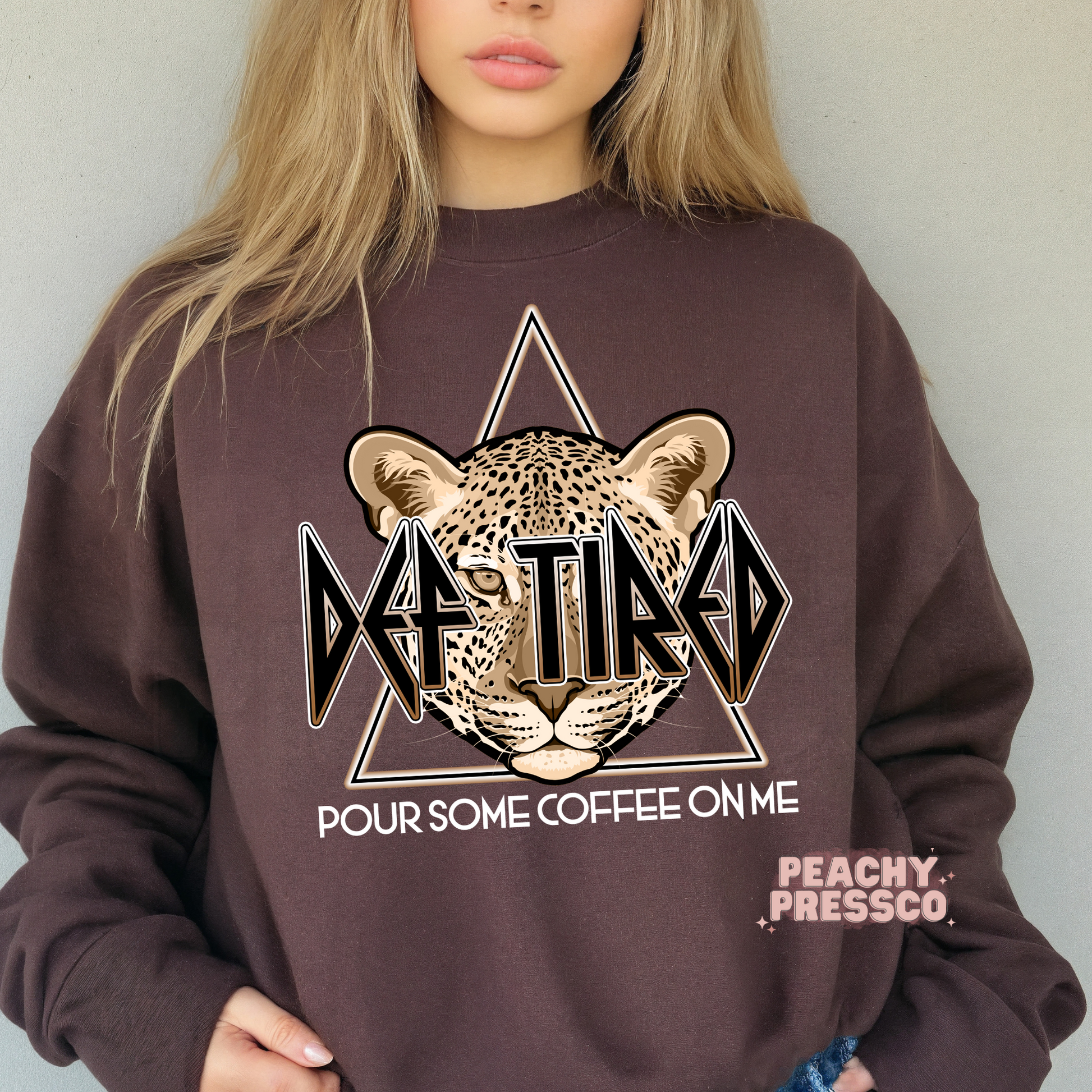 Def Tired, Pour Coffee On Me Crewneck, Sweatshirt – Funny Leopard Graphic for Coffee Lovers Apparel