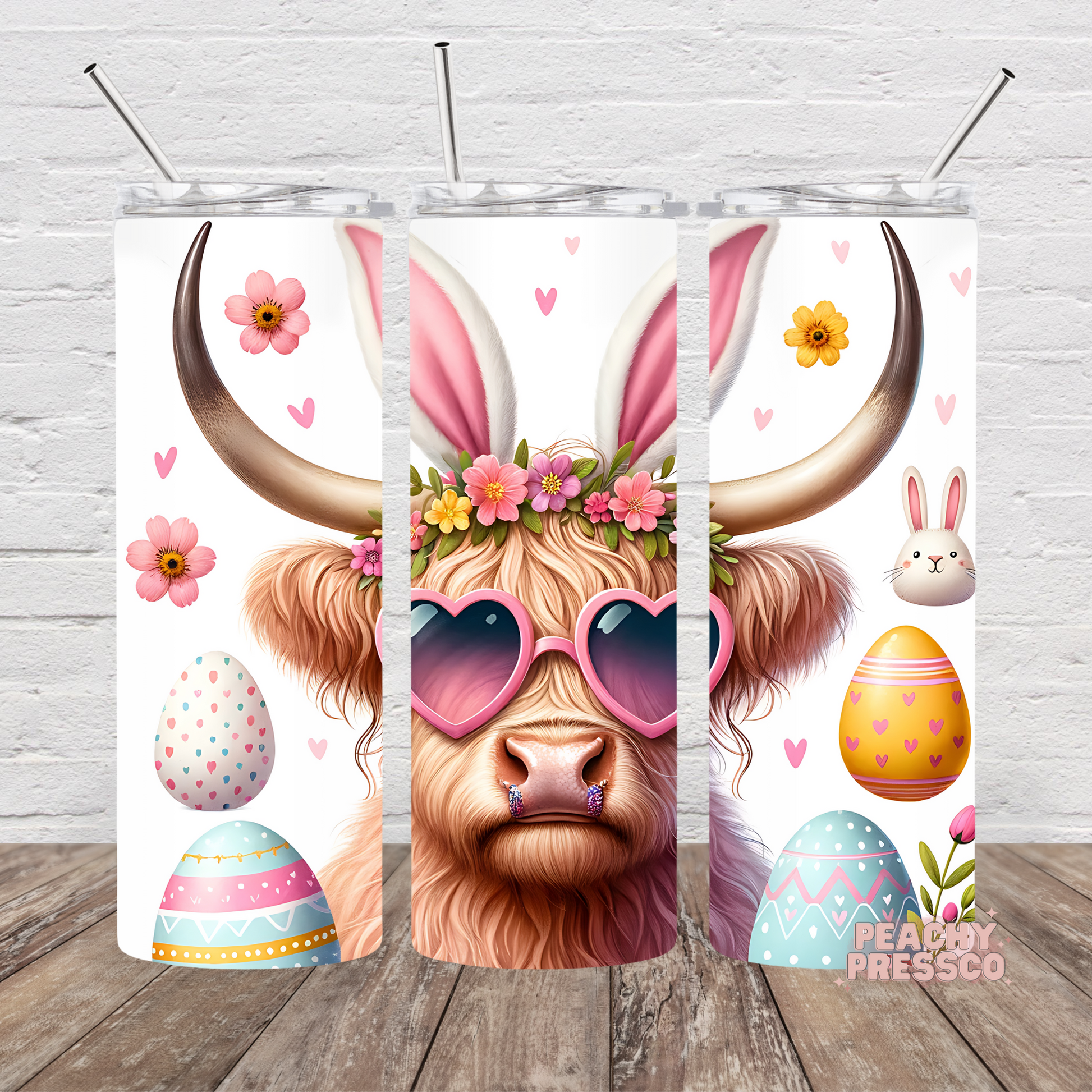 Easter Highland Cow Tumbler – Bunny Ears & Eggs