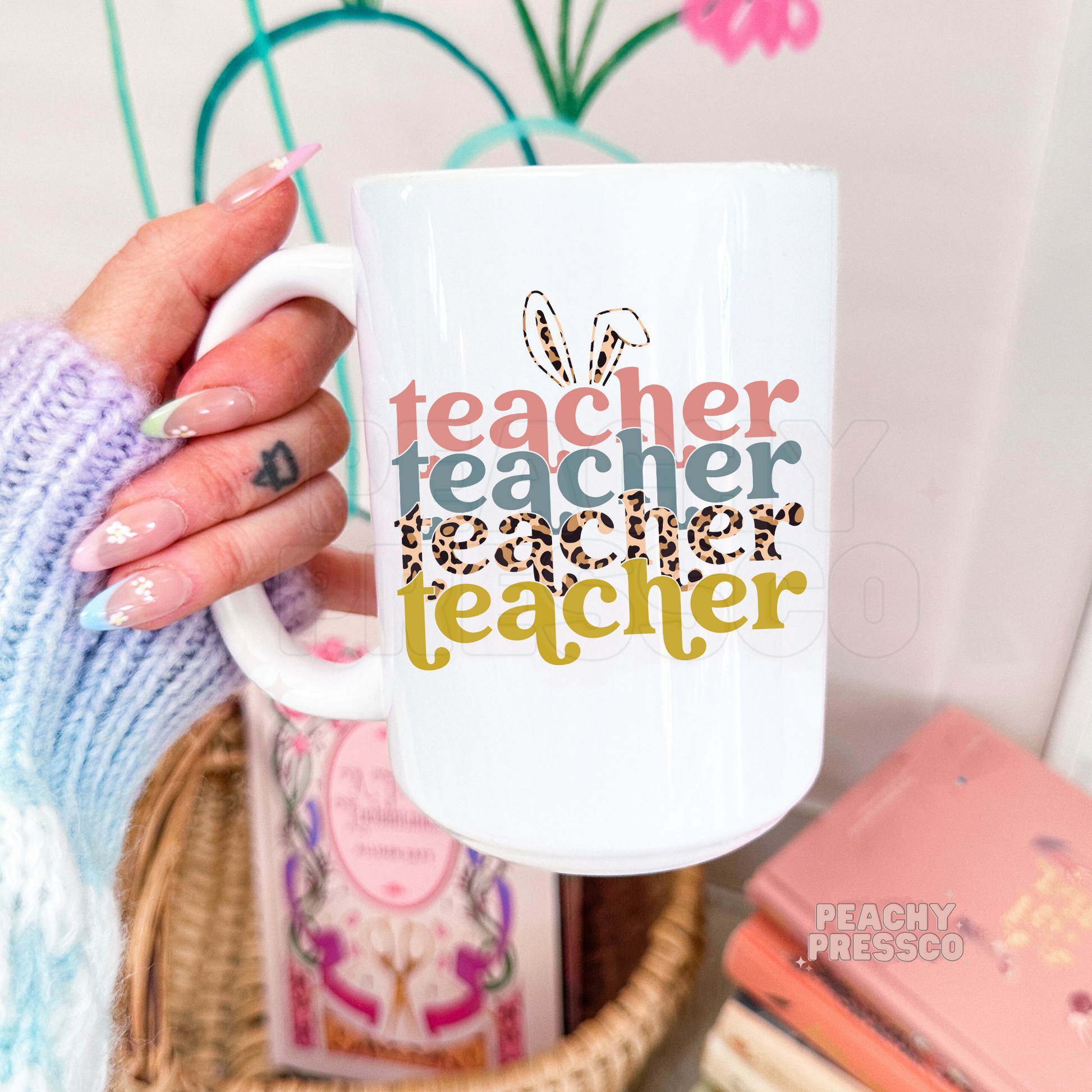 Easter Teacher Mug – Rainbow Leopard Print Bunny Ears Design