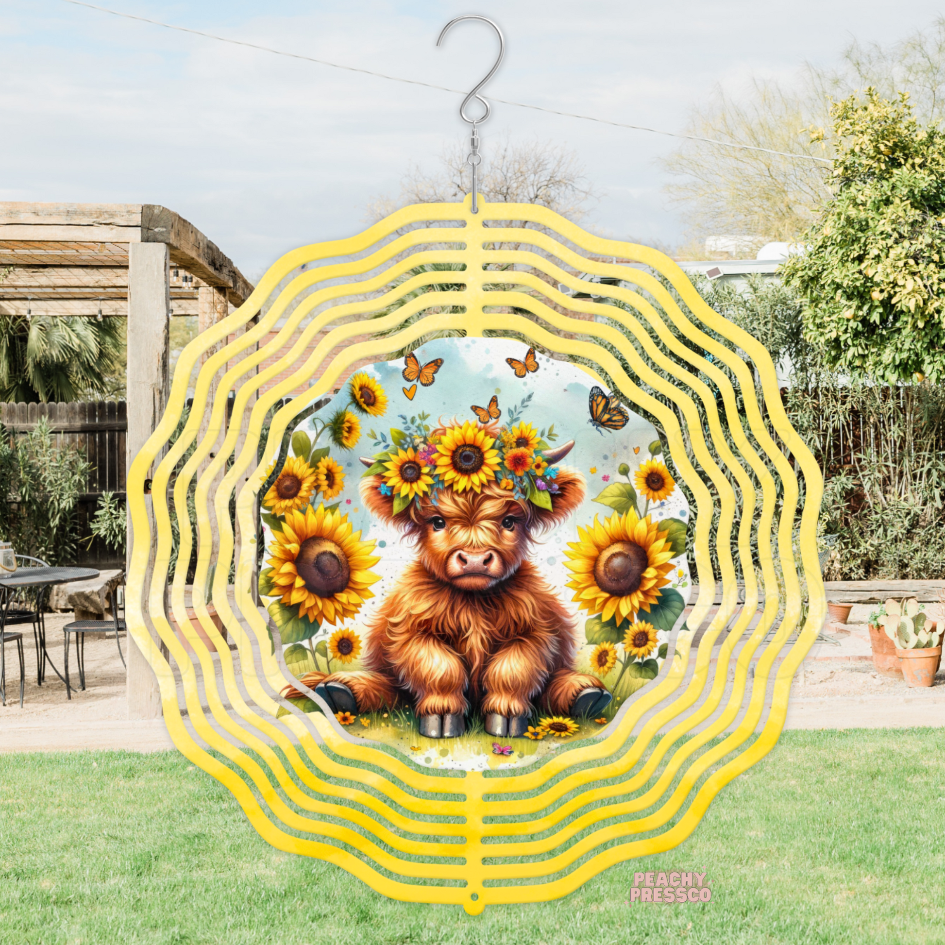 Flower Crown Highland Cow Wind Spinner – Cute Farmyard Decor