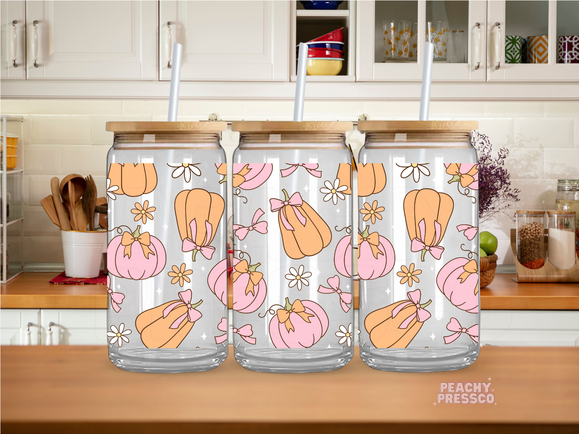 Girly Pumpkin & Bow 16oz Glass Cup – Pastel Pink Fall Aesthetic