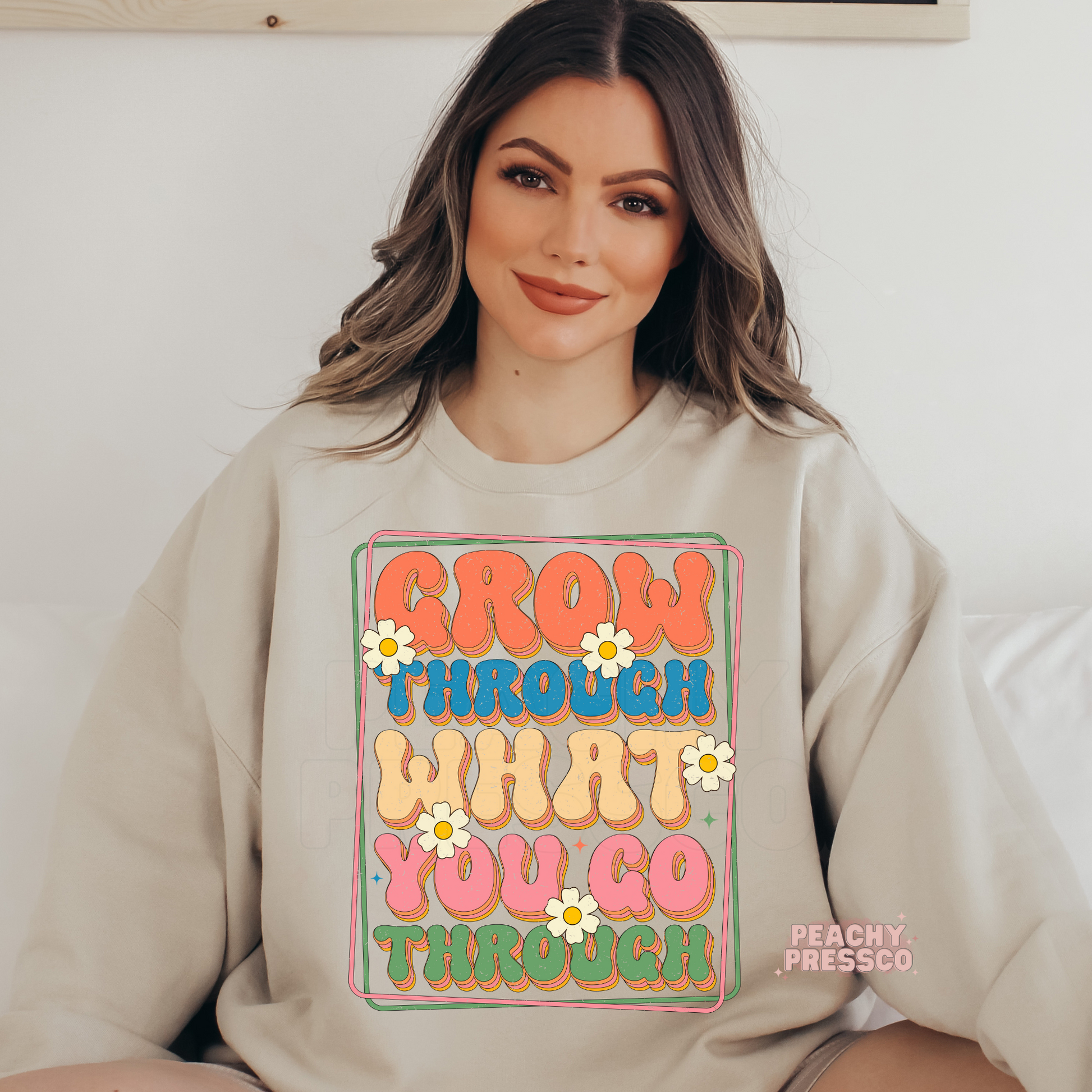 Grow Through What You Go Through T-Shirt – Motivational Flower Graphic, Positive Retro Style