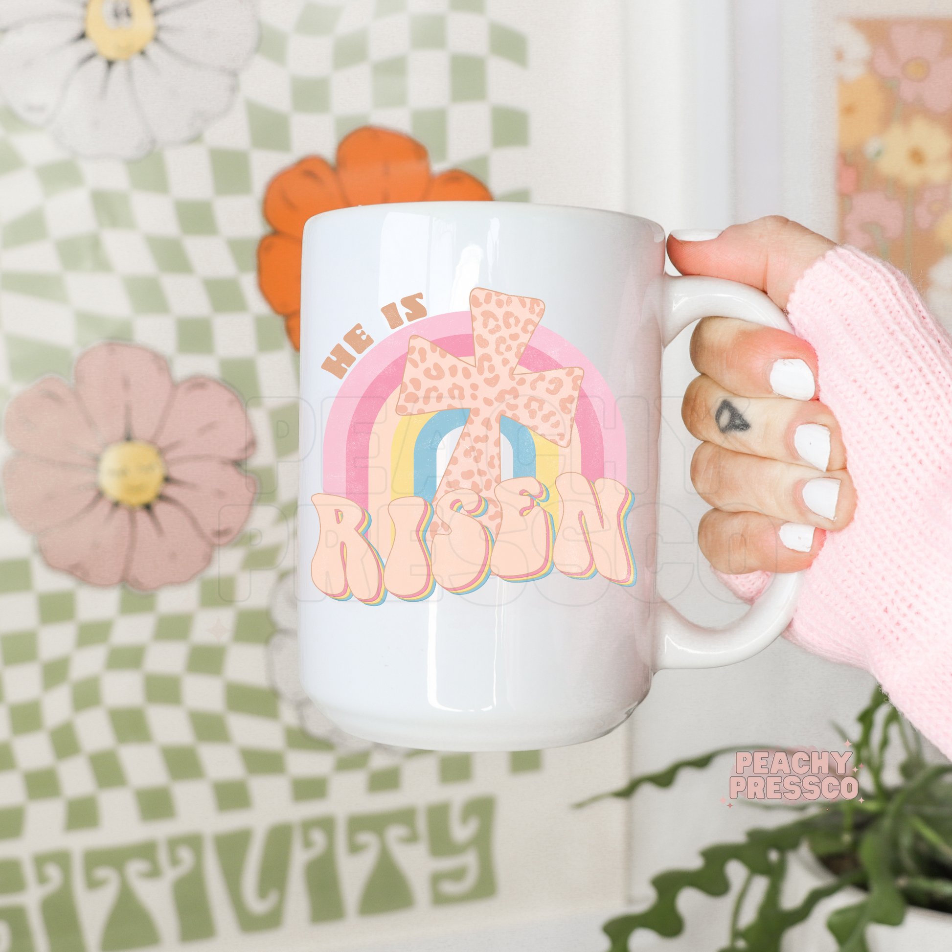 He Is Risen Mug – Retro Leopard Cross Easter Coffee Cup