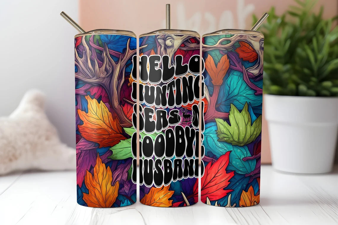 Hello Hunting Season Goodbye Husband Tumbler – Funny Fall Leaves Deer Design