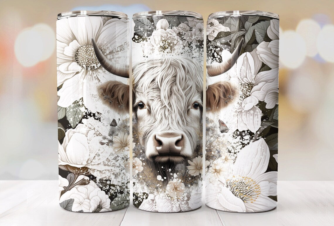 Highland Cow, Black and White Floral Tumbler – Neutral Boho Aesthetic Drinkware