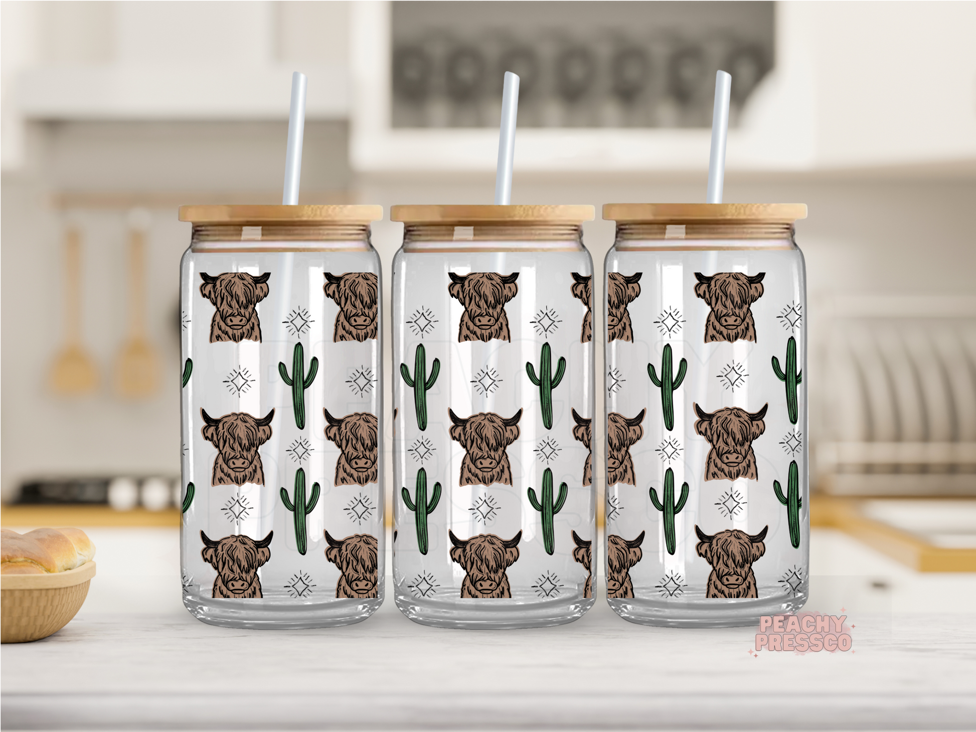 Highland Cow & Cactus 16oz Glass Cup – Western Boho Glass