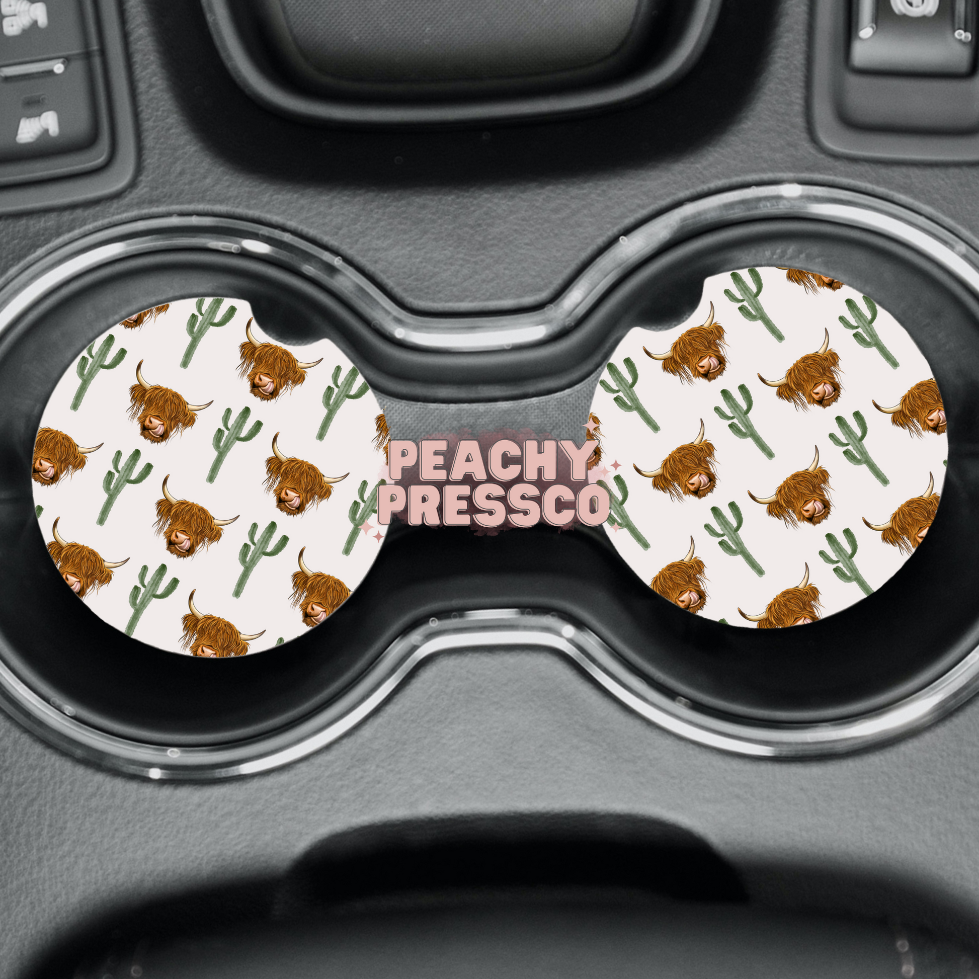 Highland Cow & Cactus Car Coasters – Western Aesthetic Cupholder Decor Set