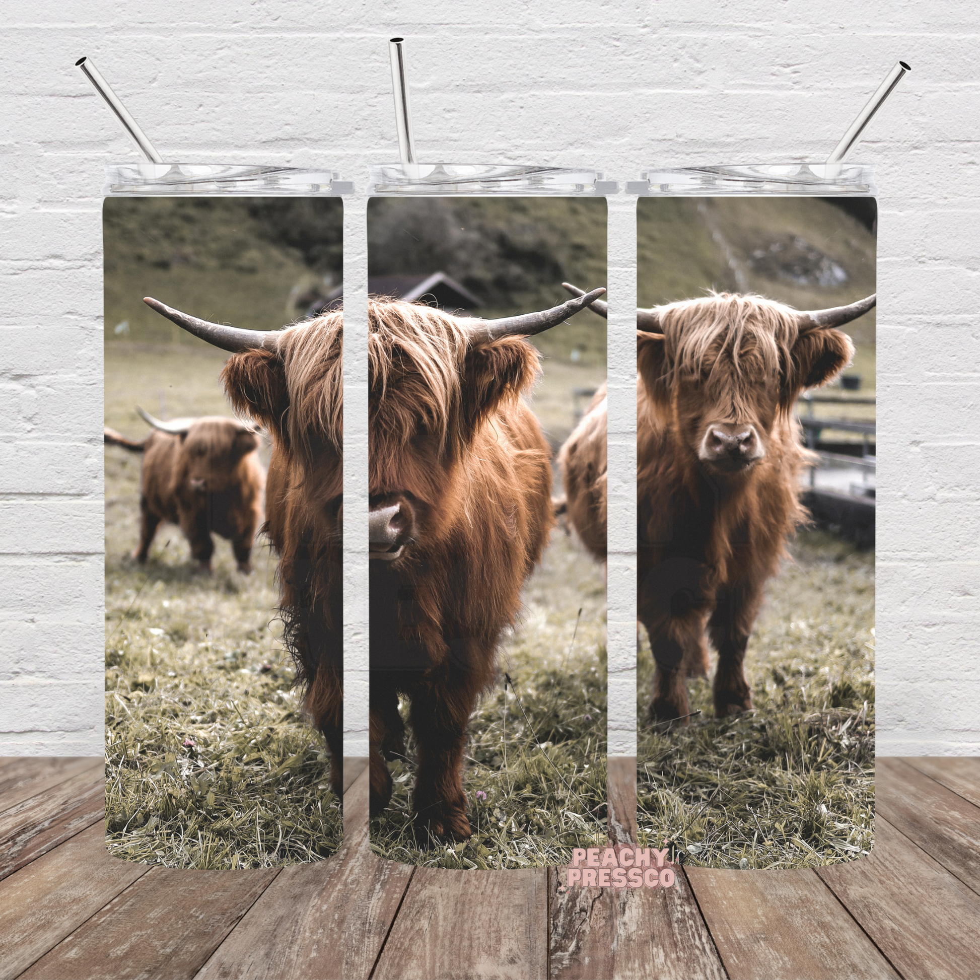 Highland Cow Coffee Tumbler – Rustic Farm Scene with Scottish Cattle
