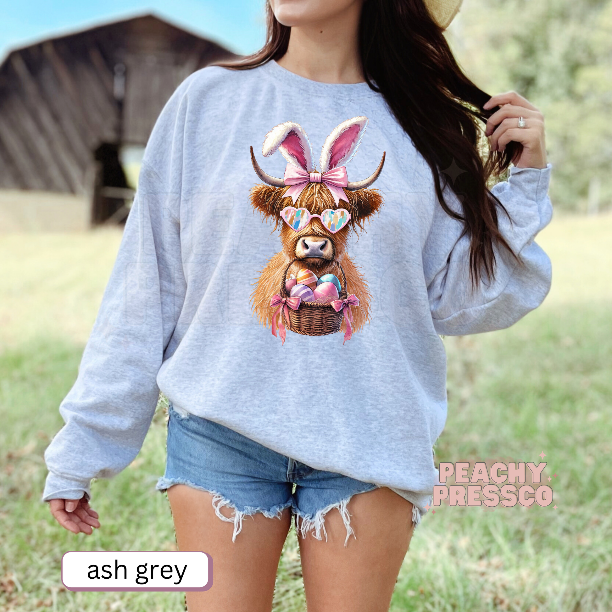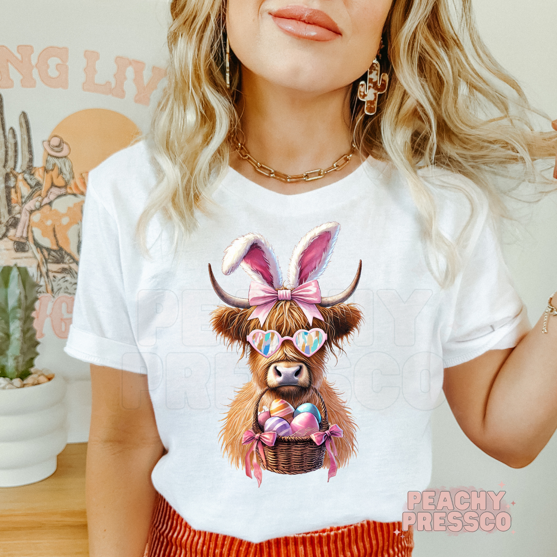 Highland Cow Easter Shirt – Bunny Ears, Sunglasses & Egg Basket Apparel