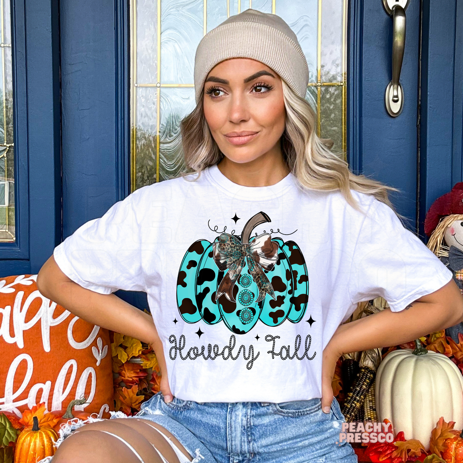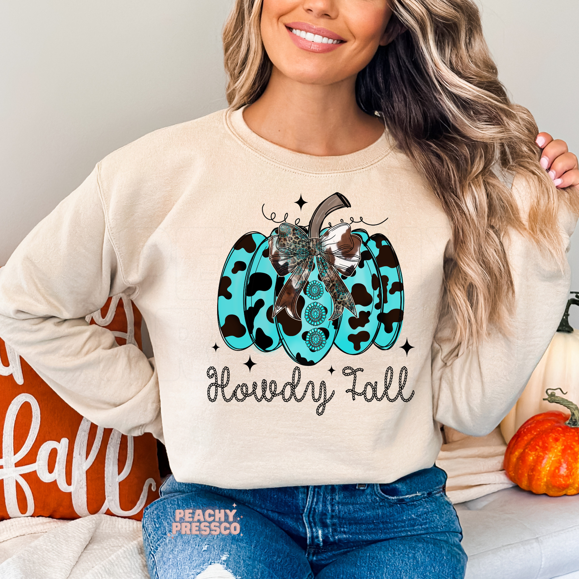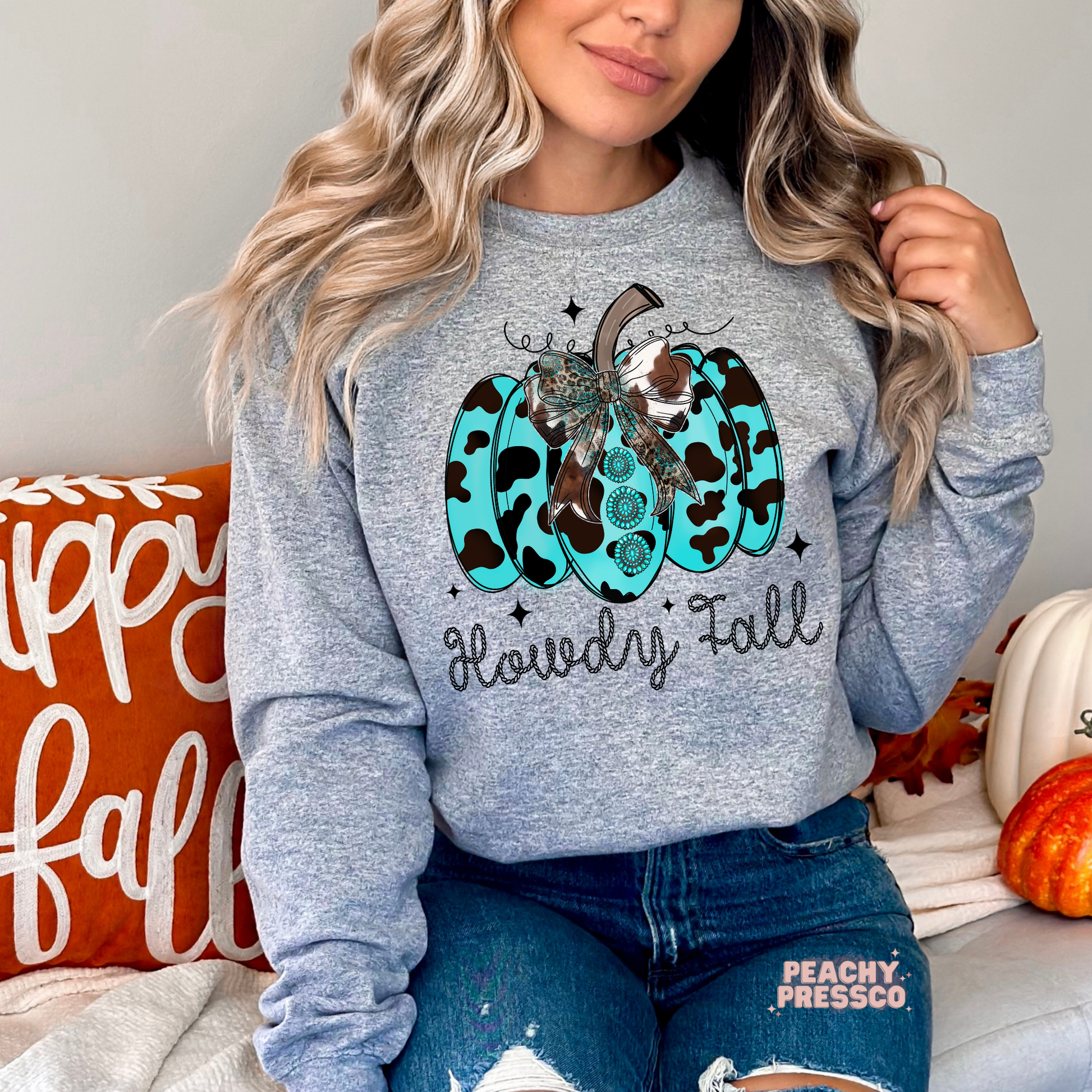 Howdy Fall Sweatshirt, Turquoise Cowprint Pumpkin Fall Apparel