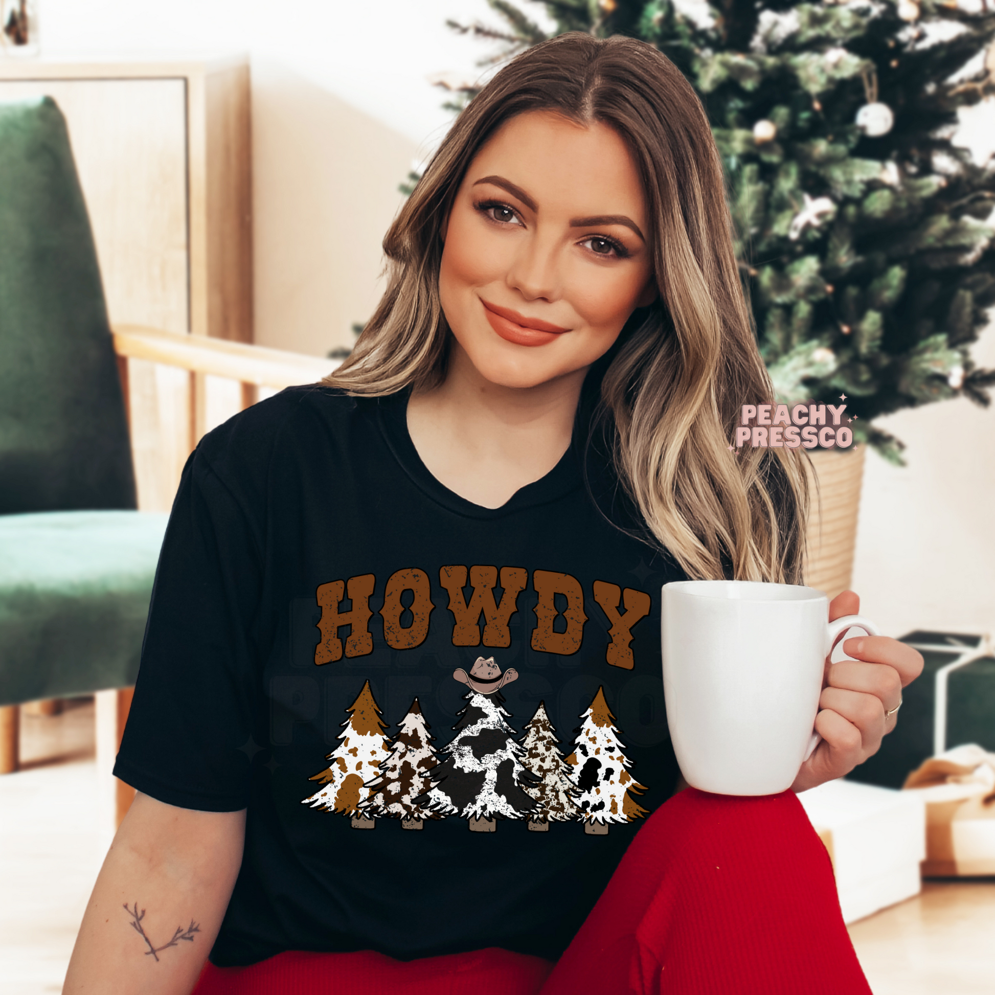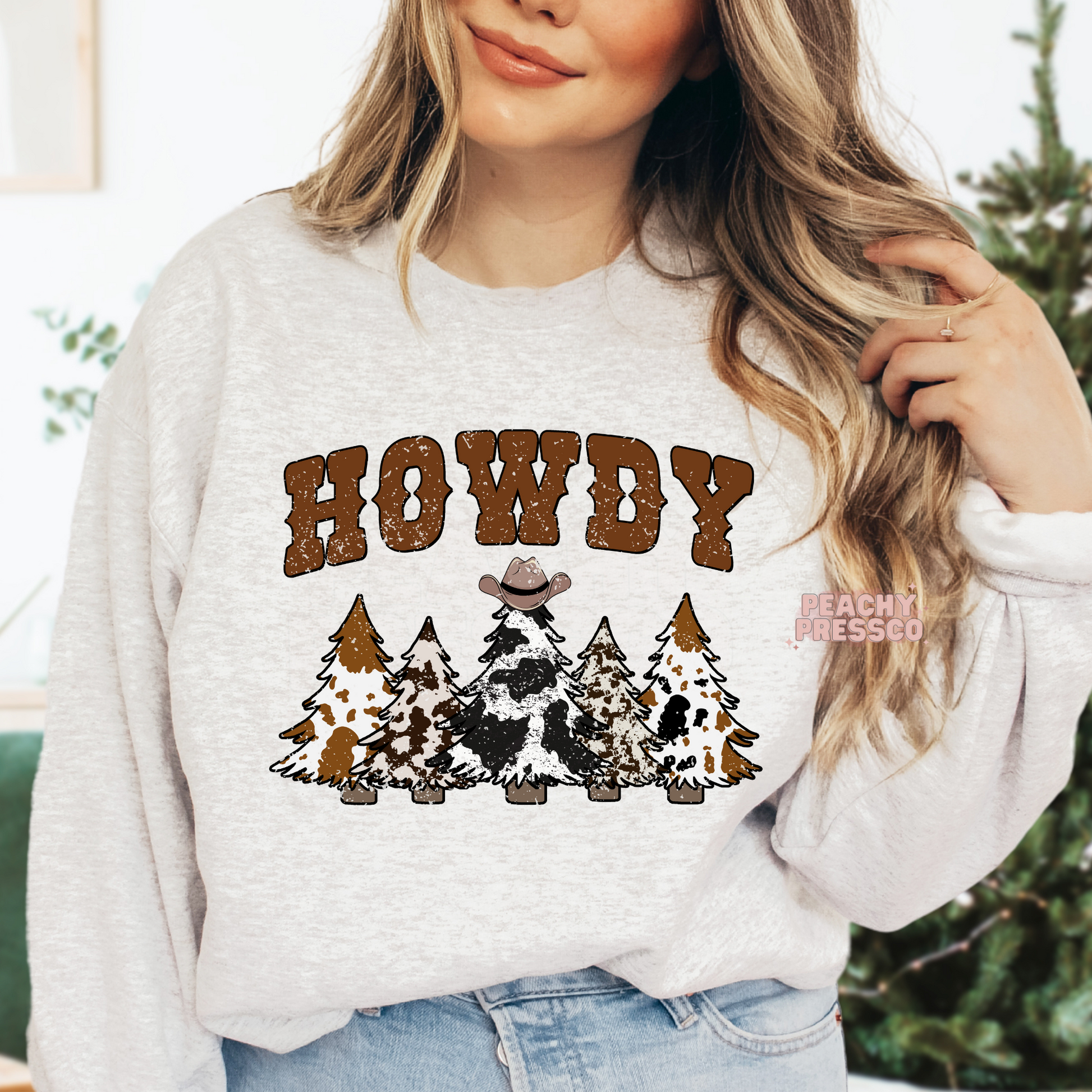 Howdy Holidays Cowboy Christmas Hoodie – Rustic Charm with Cowprint Trees Apparel