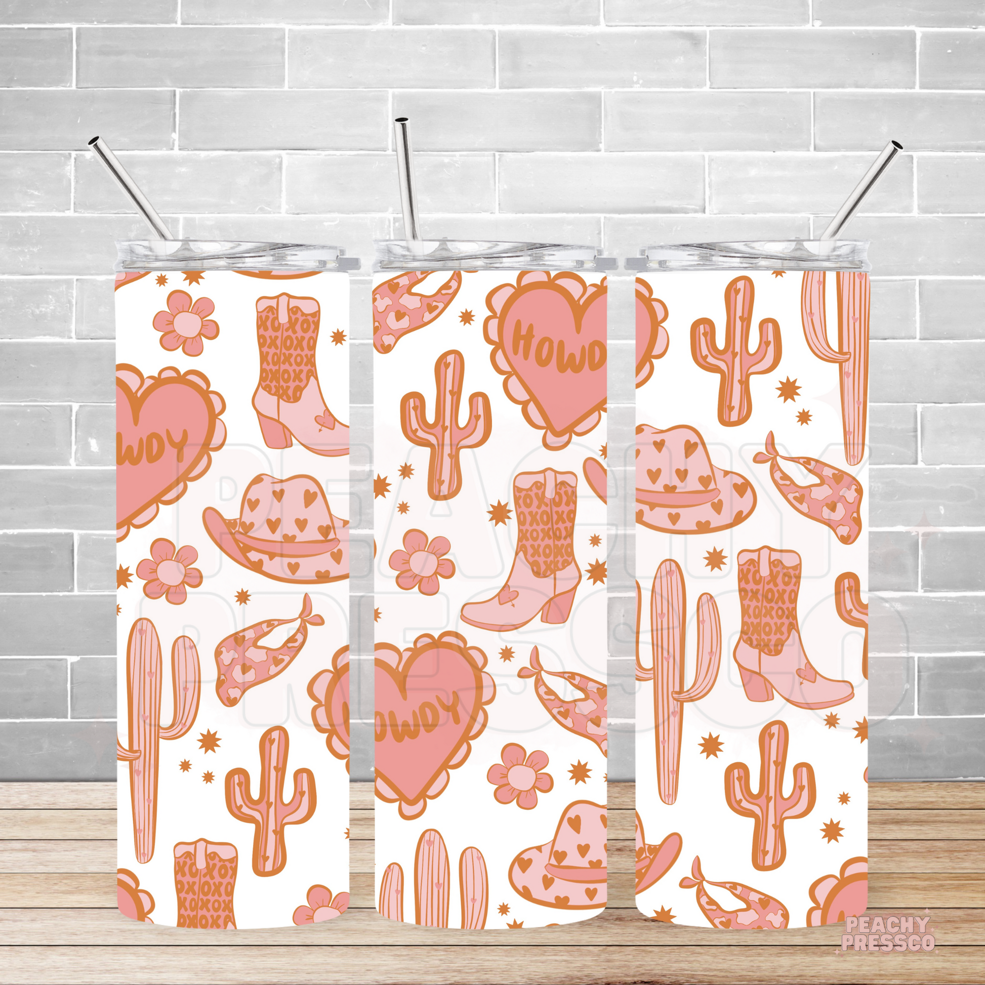 Howdy Western Tumbler – Pink Cow Girl Boots, Cactus & Cow Boy Hat Design