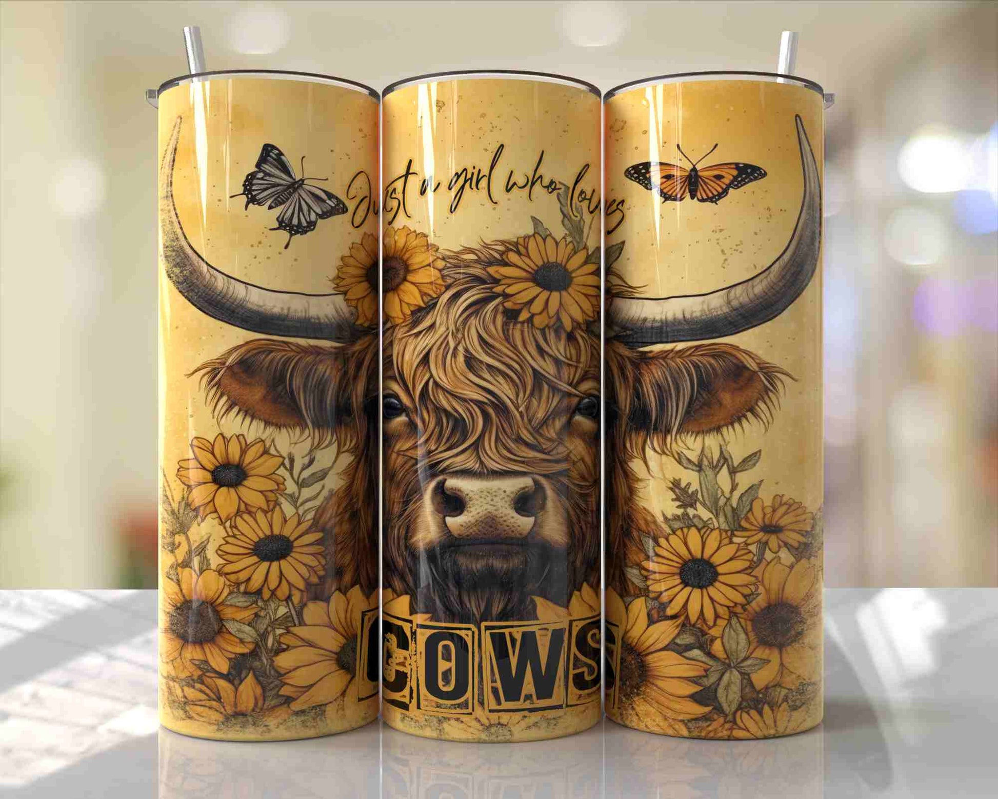 Just a Girl Who Loves Cows Tumbler – 20oz Highland Cow & Sunflower Drinkware