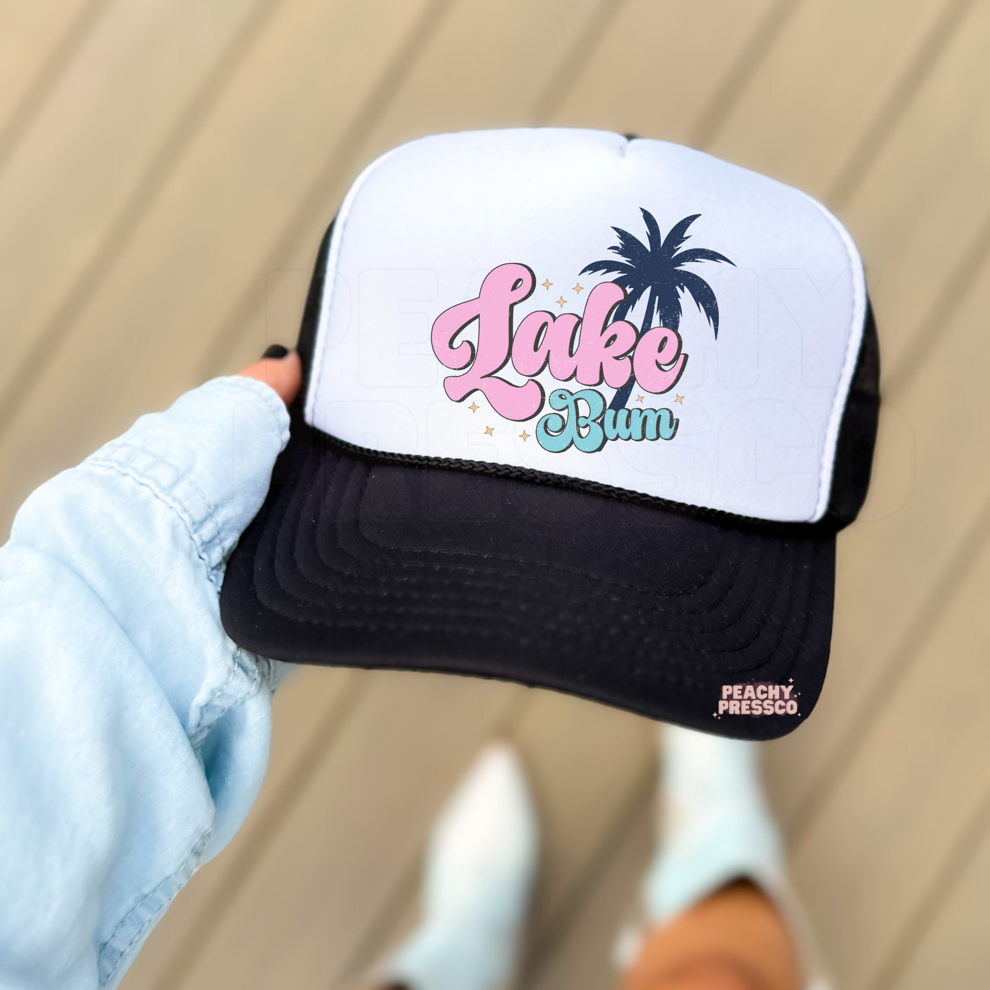 Kick back with our Lake Bum trucker hat, designed with fun retro fonts in pink and aqua, plus a chill palm tree vibe. Ideal for lake days and sunny getaways.