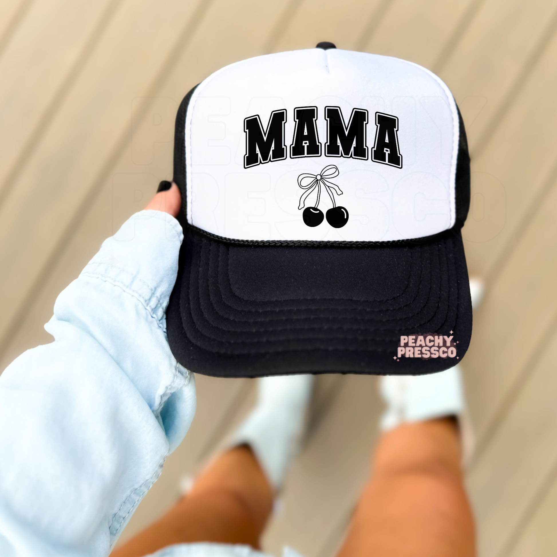 Mama Trucker Hat with Cherry Design – Cute Black & White Retro Mom Cap