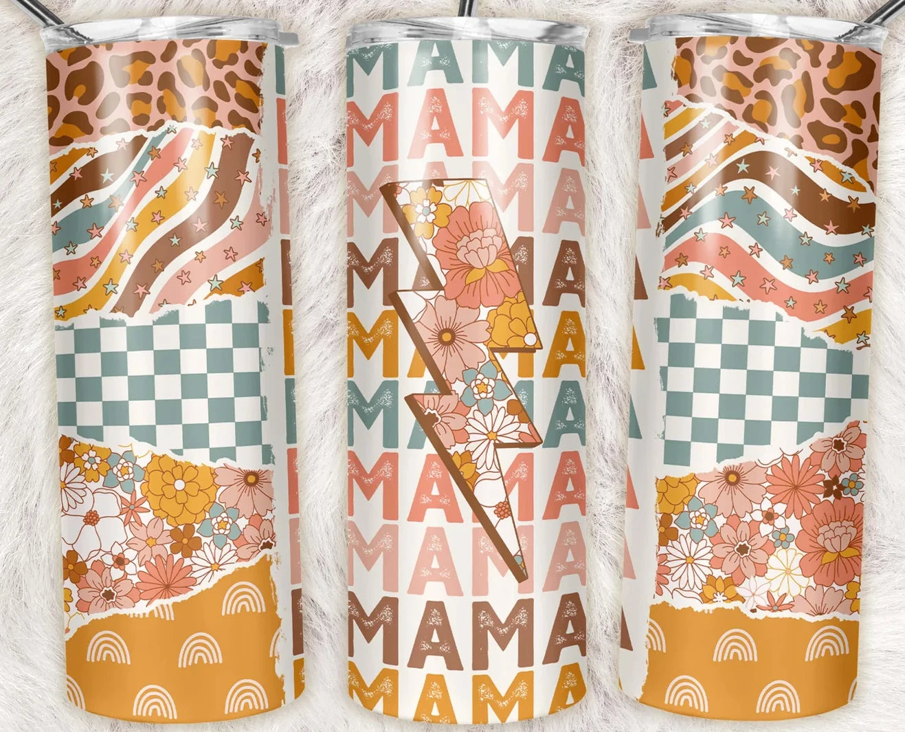 Mama Tumbler, Retro Stack Cup in Neutral Boho Colors – Floral, Leopard & Checkerboard Design