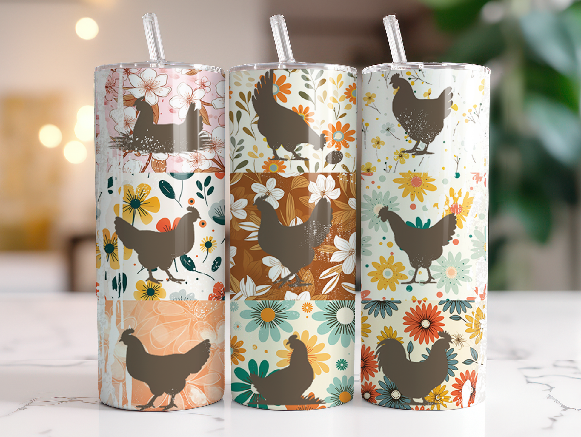 Patchwork Chicken Tumbler – Retro Floral Farmhouse Cup