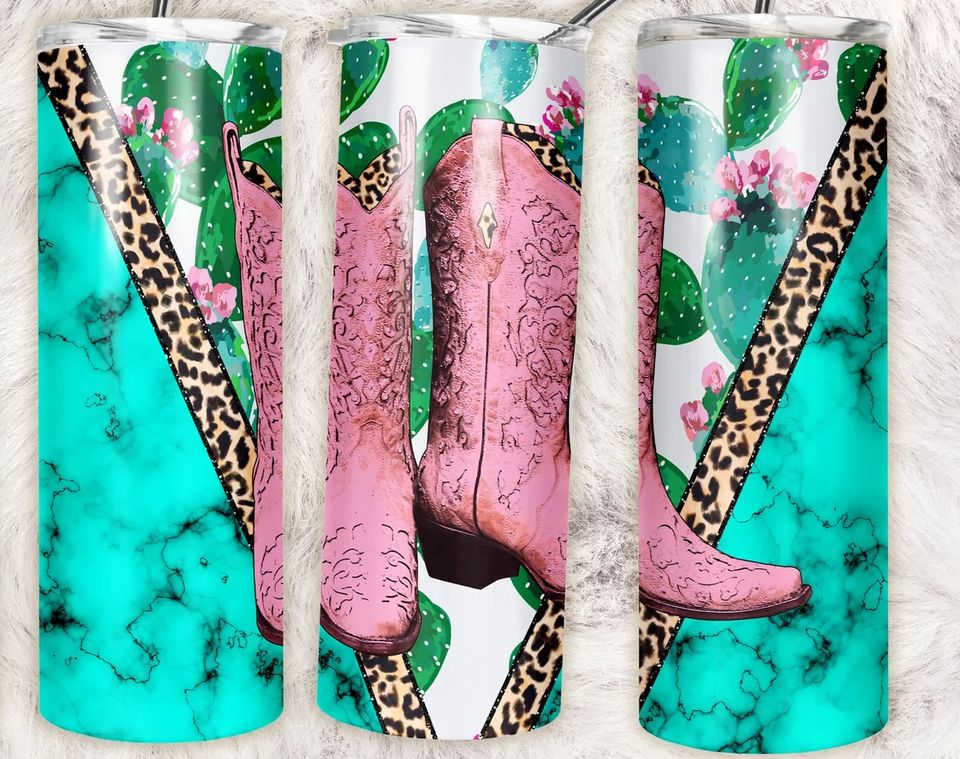 Pink Western Cow Girl Boots with Leopard Print & Teal Marble Tumbler