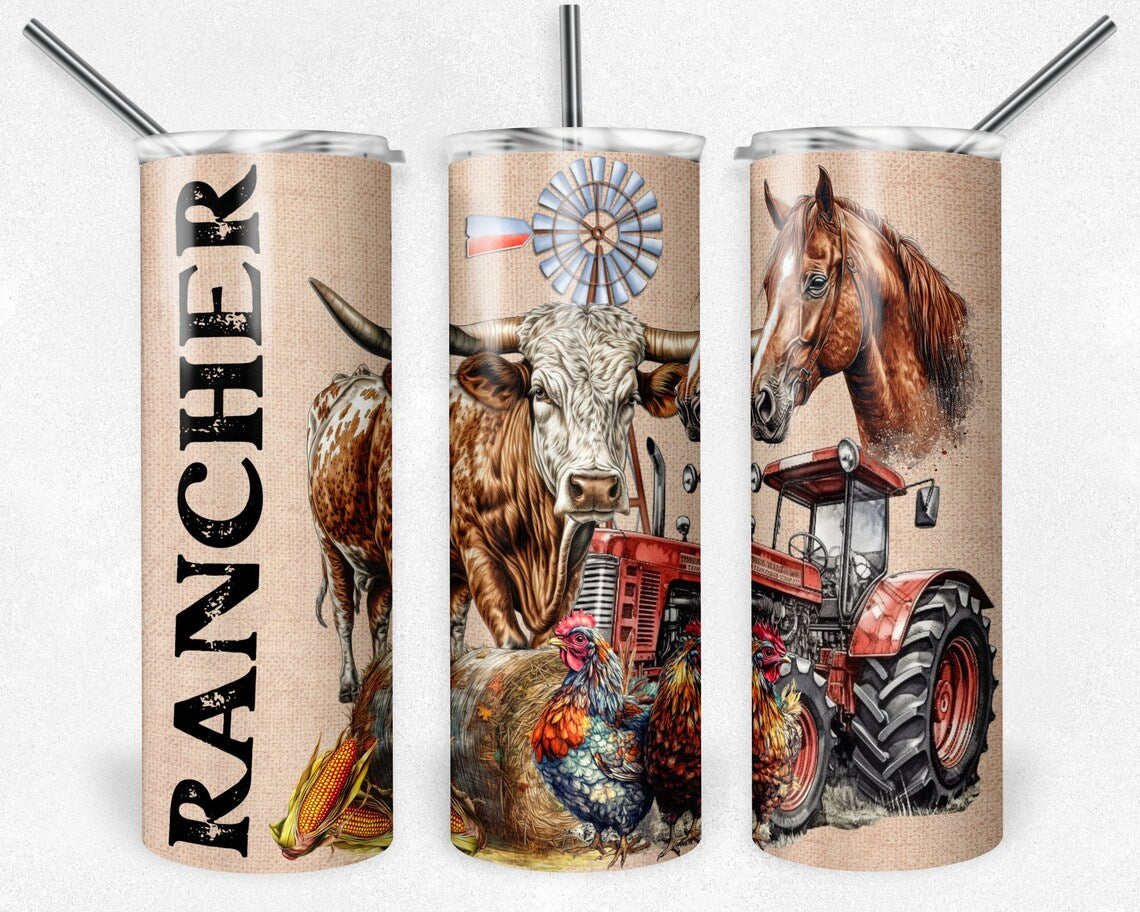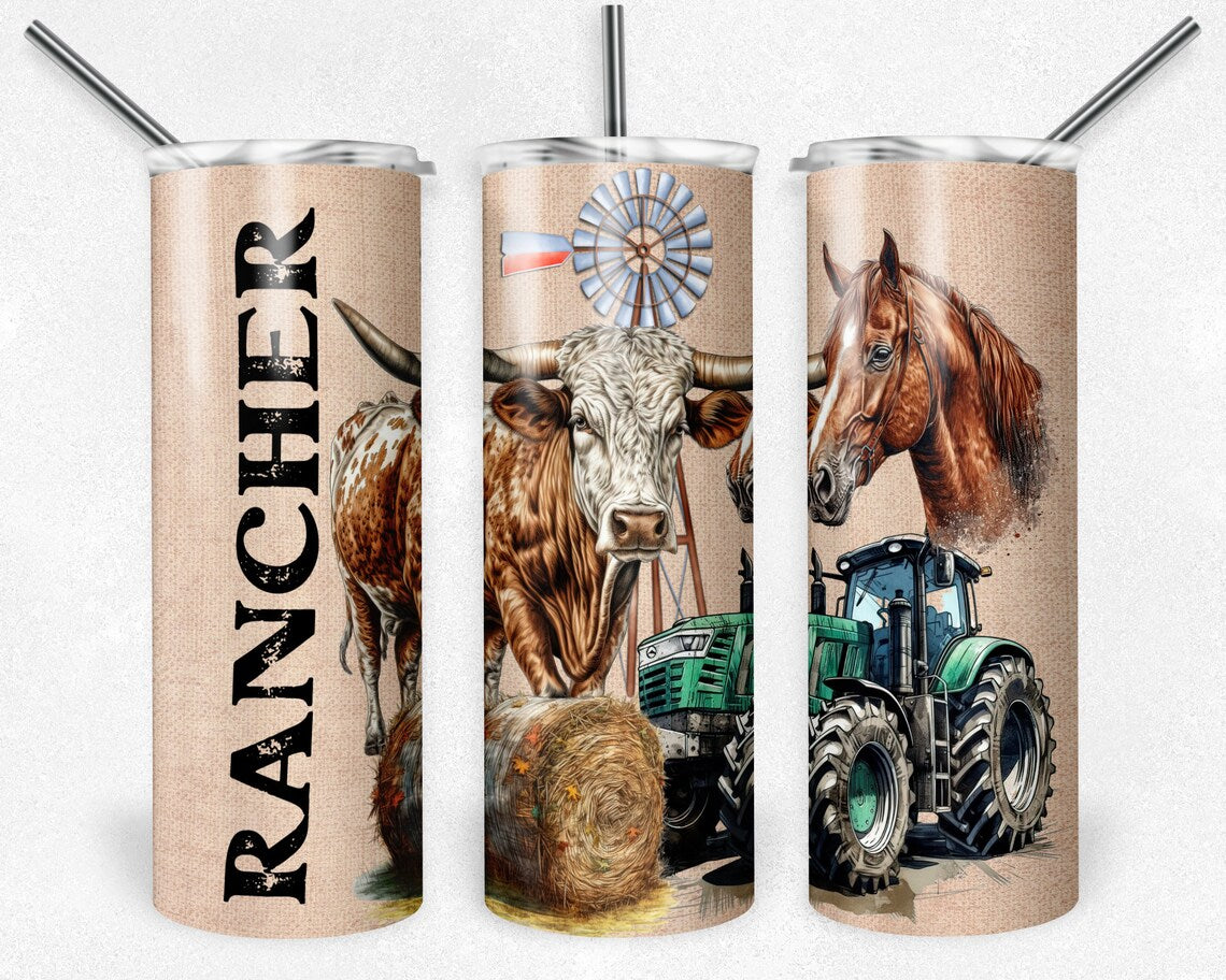 Rancher Tumbler – Western Farm Cup with Bull, Horse & Tractor – Country Life Drinkware for Cow boys & Ranch Hands