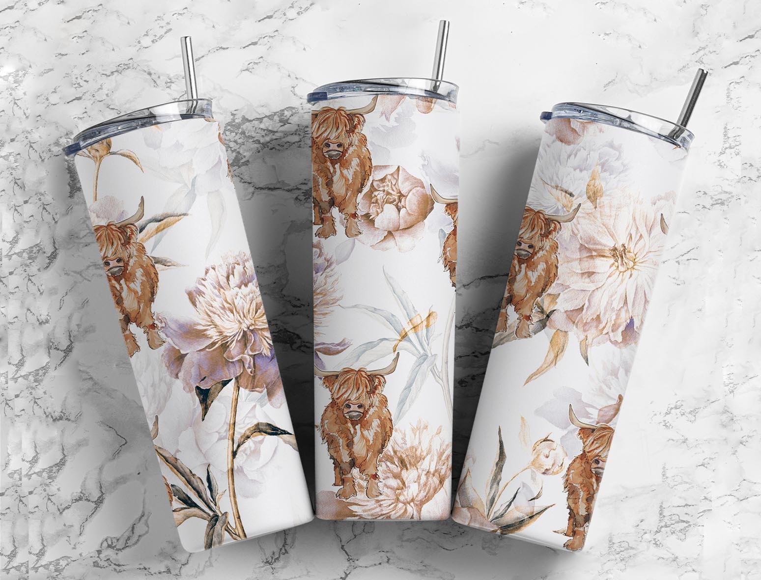 Rustic Floral Highland Cow Tumbler – 20oz Boho Western Drinkware