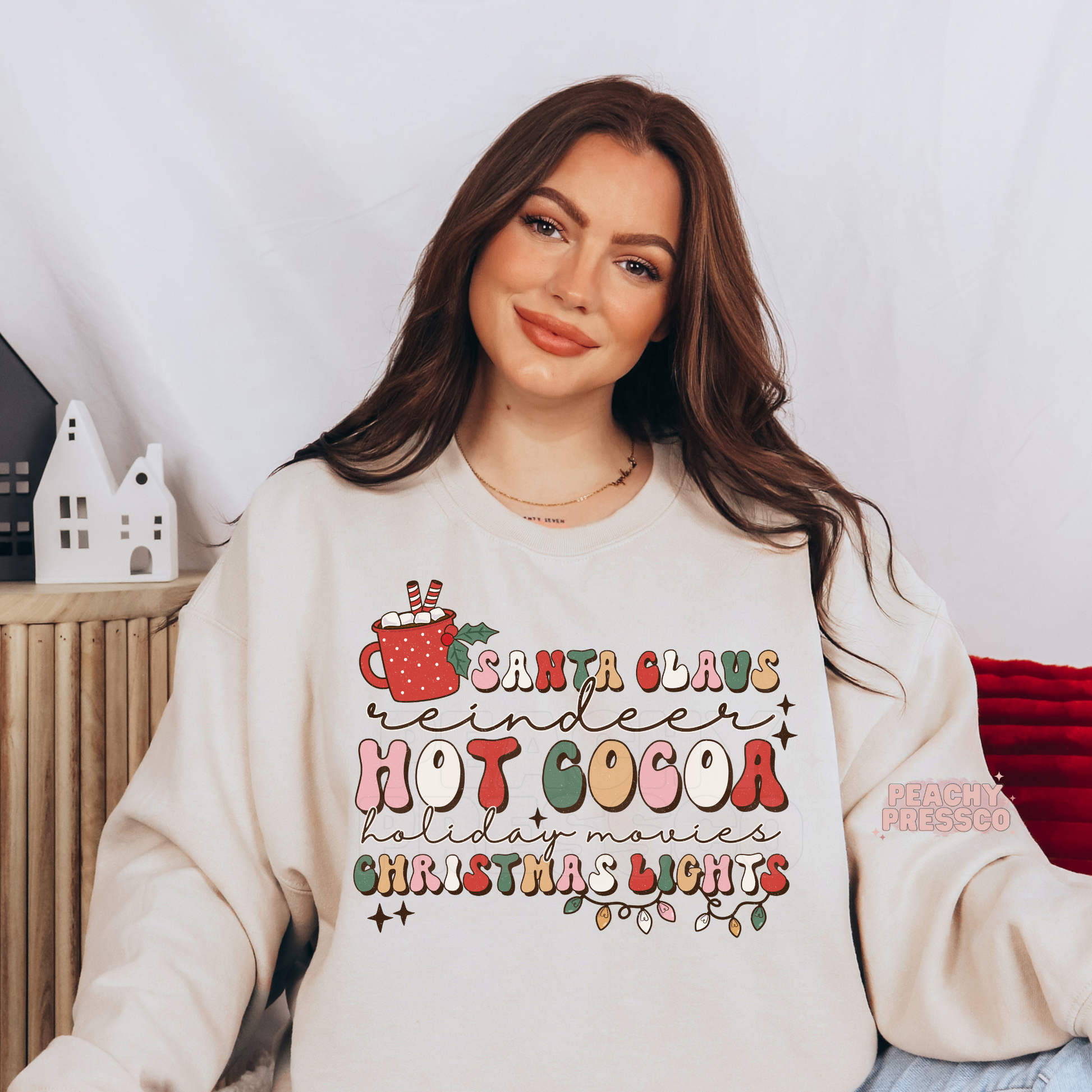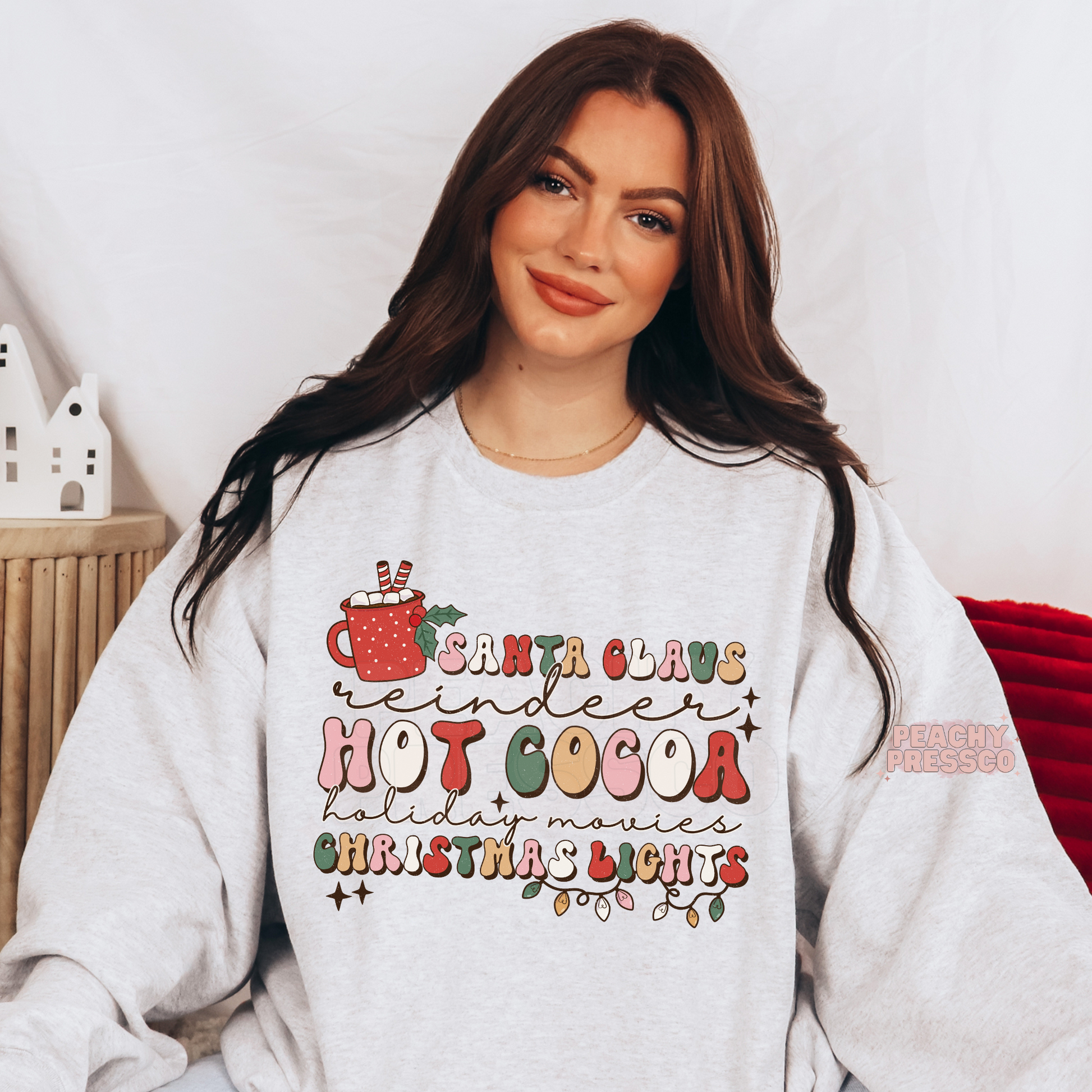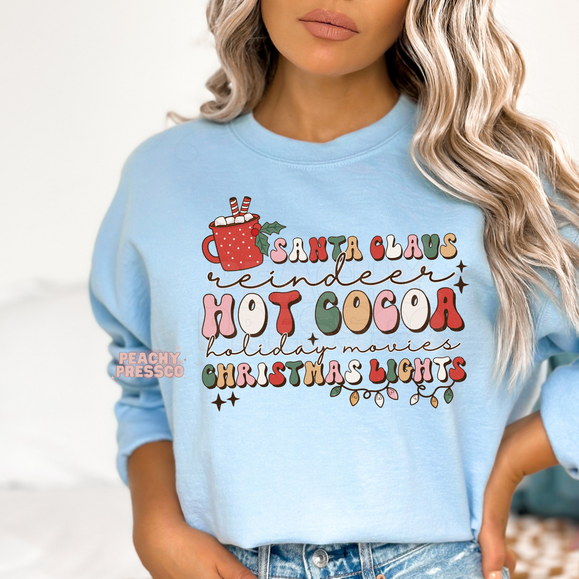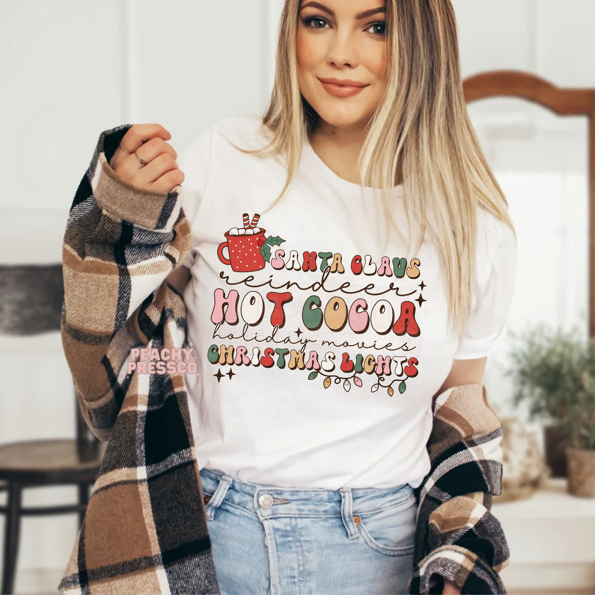Santa Claus Reindeer Hot Cocoa Christmas Lights Tee – Holiday Movies Apparel