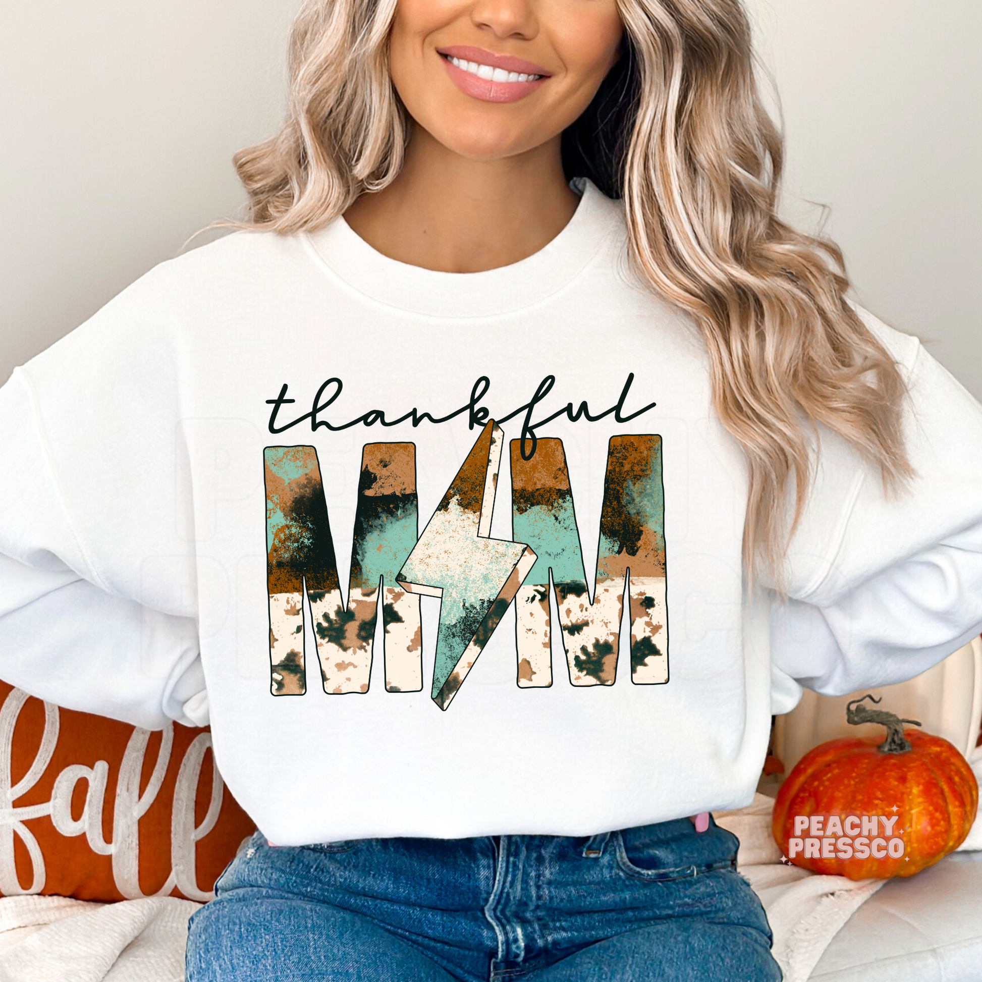 Thankful Mom Lightning Bolt Fall Sweatshirt – Cozy Autumn Cow Print, Rustic Style Apparel